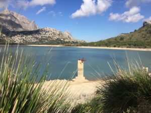 Wir laufen weiter zu dem nächsten Stausee. Hier soll eine kleine Wanderrunde sein. Wir gehen durch ein Viehgatter und sehen kleine Esel, die mit Schafen und Ziegen hier herumlaufen. Vor uns liegt der See. Schön, wie die Sonne die Farben im Wasser verändert. Wir gehen den Weg am See entlang und genießen die Wärme und den Wind. Es ist kein spektakulärer Weg, aber schön.