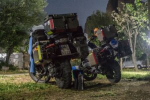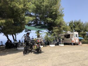 Nach dem Aufbau gibt es erstmal Kaffee und Kekse. Gestippte Kekse… lecker. Micha schaut sich die Reifen von Rosi und Bobber an. Eigentlich sollten die Reifen in Rumänien oder Bulgarien gewechselt werden. Die Reifen haben jetzt ca. 8.000km auf dem Buckel. Micha führ ein paar Telefonate. Er ruft schlussendlich in Deutschland bei Heidenau an. Und ich muss sagen, der Herr Schäfer von Heidenau hilft. Es gibt einen Dealer für Heidenau Reifen in…. Thessaloniki. Oh neee…. da waren wir schon. Und nu?