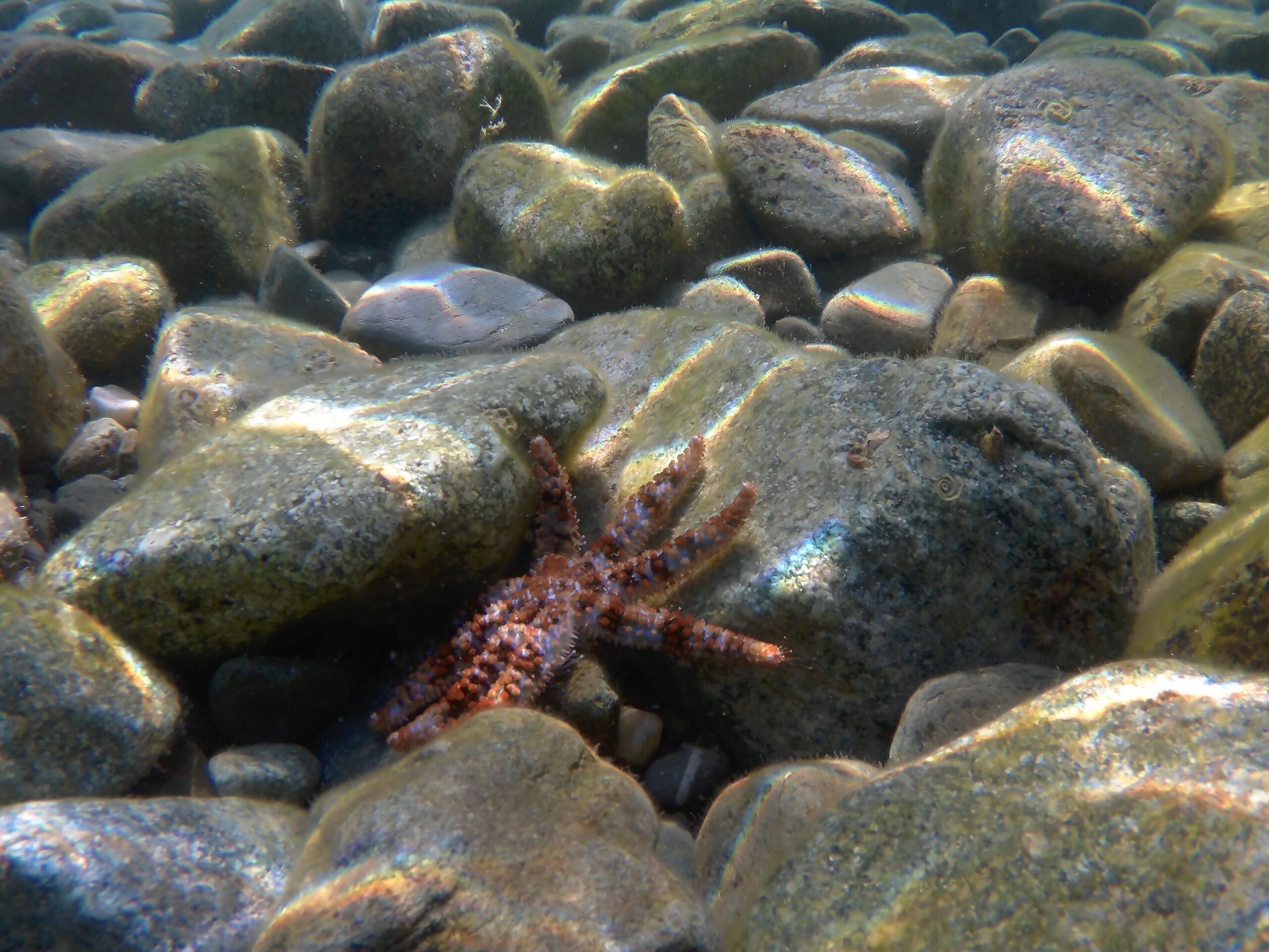 Die Rundfahrt ist schön. Am frühen Nachmittag sind wir zurück. Ich möchte noch ein wenig im Wasser nach Garnelen und anderem Getier schauen. Micha liest. Am und im Wasser treffe ich Elke und Bernd. Es ist schön. Elke schnorchelt und Bernd angelt. Wir haben einfach einen schönen Tag. Und erfolgreich war ich auch. Als Fotoausbeute gibt es heute Seestern (und natürlich auch mit belebtem Bild). Das ich fast auf ihm gestanden habe und nur durch einen blöden Zufall den Kollegen gesehen habe, da schmunzle ich immer noch. Man muss nicht immer suchen, manchmal wird man gefunden.