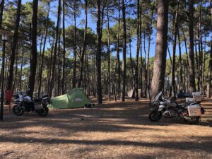 Der freundliche junge Mann sagt uns, das wir uns einen Platz aussuchen können. Wir machen uns auf die Suche und sind 15 Minuten später fündig. Es ist ein Platz mit schöner Aussicht, nicht zu weit zum Sanitär. Die Motorräder direkt vor dem Zelt.
