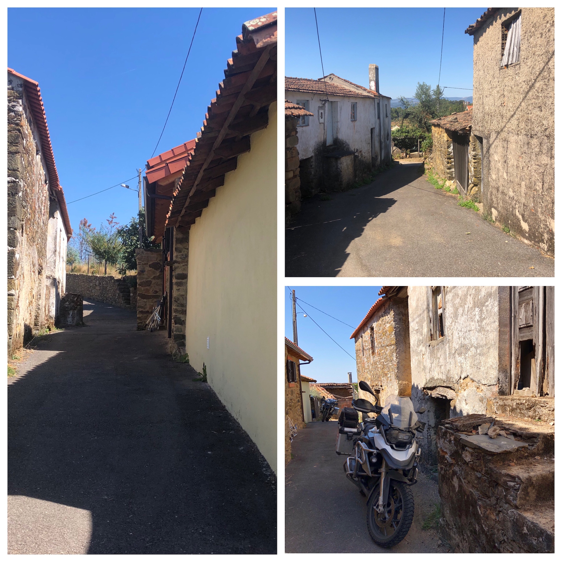 Das Zelt kann wieder trocken eingepackt werden. Das genießen wir jedes mal. Schnell noch an der Rezeption bezahlt und los geht die Fahrt. Wir freuen uns Beide auf das Inland. Hier an der Küste macht das Fahren keinen Spaß, da alles so dicht bebaut ist. Wenn dann mal kein Haus steht, ist eine Mauer zu der Straße und Mais ist hinter der Mauer angepflanzt. Das ist schon kurios. Einige Häuser und auch Wohnblöcke haben auch Nutzgärten. Auffälig ist auch, das viele kleine Häuser langsam zerfallen und neben an ein neuer Wohnblock gebaut wurde. Anscheinend möchten die Portugiesen lieber in Wohnungen leben als in kleinen Häusern, zumindest hier an der Küste. Dann gibt es wiederum kleine Orte, wo der alte Ortskern noch relativ gut erhalten ist.