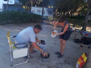 Heute Abend wird kurzerhand gegrillt. Uwe hat einen Faltgrill mit (das kannte ich noch nicht, da war ich hin und weg). Da ich noch in meiner Motorradhose am Tisch sitze (am Tag der Abreise ziehe ich immer gleich die Klamotte an, weil ich keine Lust habe mich umzuziehen… da bin ich etwas faul… jetzt wird es allerdings langsam ziemlich warm) biete ich mich an eben einkaufen zu fahren. Gesagt getan, die Koffer von Bobber leer gemacht und Abfahrt. Keine 4 km weiter ist eine Einkaufsmöglichkeit. Da es kein Grillfleisch gibt, werde ich kurzerhand selber marinieren. Das Tzatziki wird auch selber gemacht. Baguette und von Sabine ein leckerer Salat runden das Ganze ab. Uns geht es so richtig gut. Wir sitzen bis spät in der Nacht zusammen.