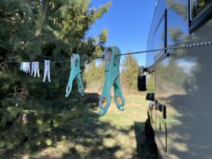 Aber auch hier ist die Lösung schnell gefunden. Hundeleine raus, Wäscheklammern raus, Leine um einen Baum schlingen und den Griff in den Griff von der Box fest machen. Fertig ist die Wäscheleine und die Klamotten können über Nacht lüften.