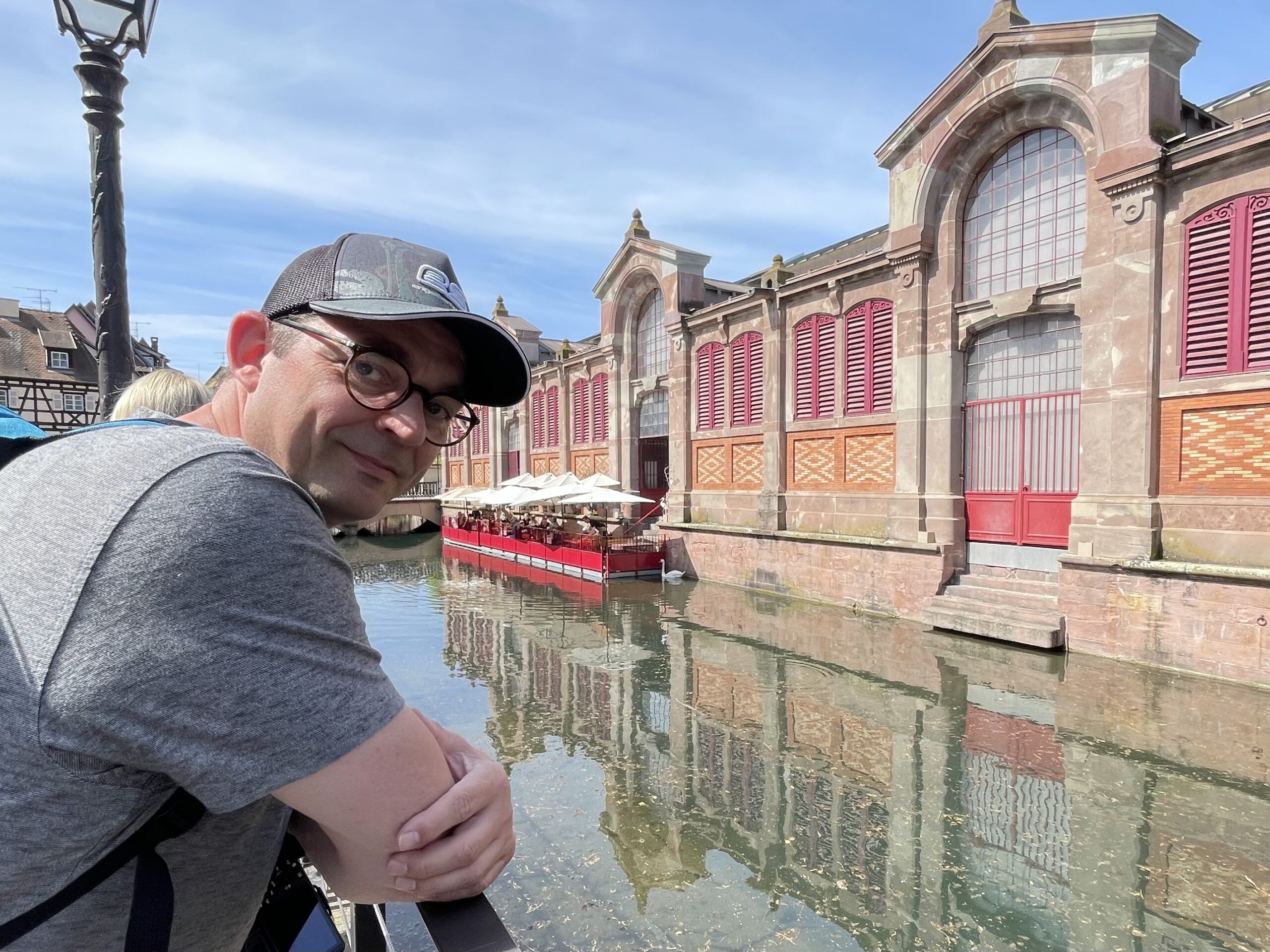 Aber zurück zur Anfahrt nach Colmar. Gerade Straßen, französische ältere Damen und Herren, die regelmäßig unregelmäßig die Bremse oder das Gas finden, ein Kreisel hier, ein Kreisel dort. Irgendwann sehen wir einen Marché. Dahinter sehen wir einen Lidl. Lidl haben wir auch bei uns, das brauchen wir nicht, also geht es zum Marché. Und wir werden belohnt. Ein Markt mit Lebensmitteln, nur Lebensmittel. Frisches Obst und Gemüse auf auslandenden Tischen, Gemüse, das sogar bedampft wird, und trotzdem nichts Überladenes. Eine Käsetheke – Wahnsinn. Yoghurt, Milch, Marmelade… ein tolles Einkaufserlebnis. Es ist nicht gerade billig, aber es lohnt sich definitiv und wir haben Urlaub.
