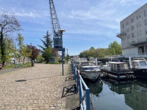 Es geht quer durch Colmar zu dem Yachthafen. Dort ist der Stellplatz. Fix ist er gefunden, Platz 14 ist für uns reserviert. Hütchen weg, Bumba rein, feststellen, dass wir Keile brauchen, Keile unter, Waagerechte? Passt. Da sind wir.