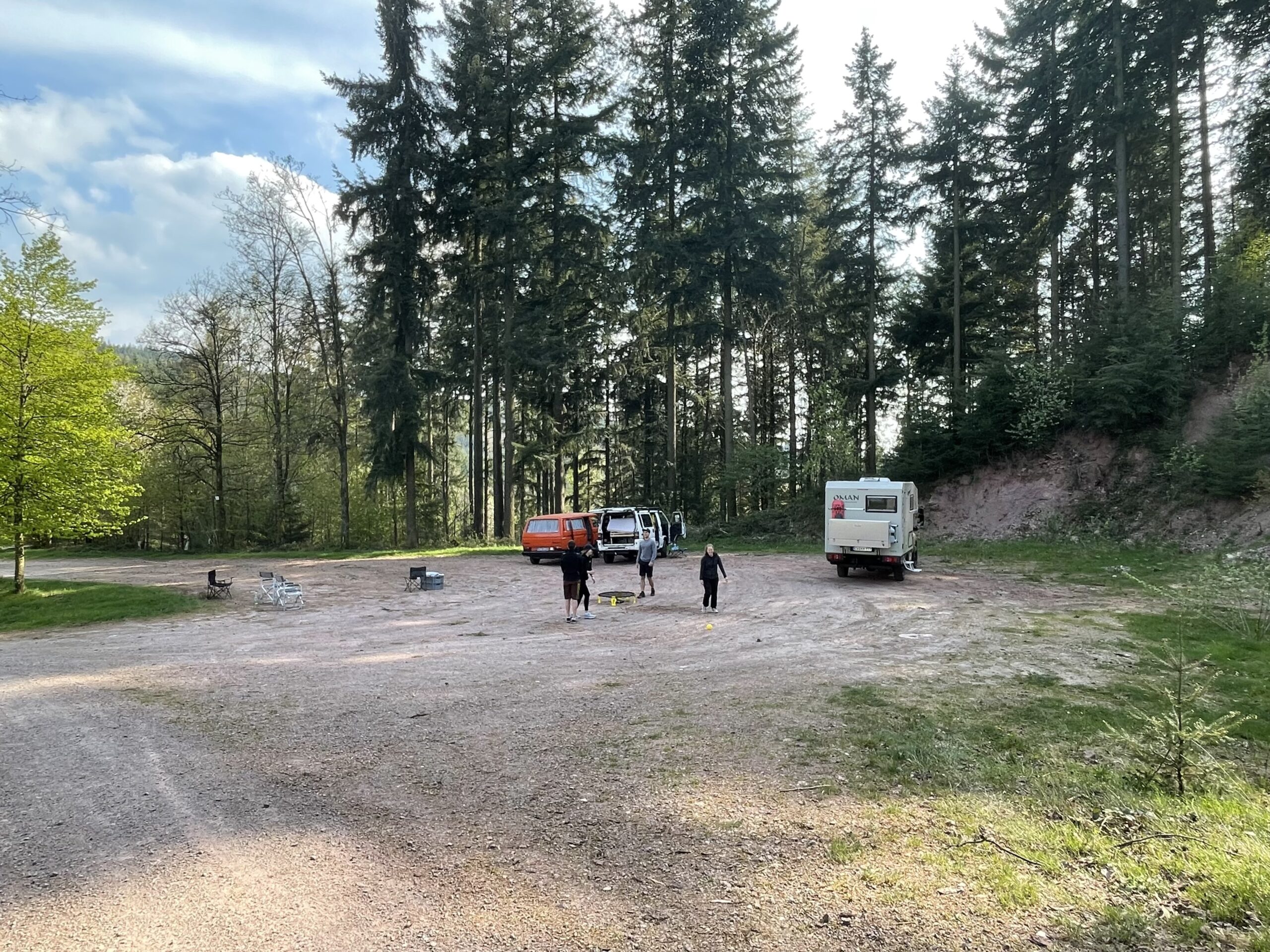 Auf der Herfahrt auf der kleinen Straßen zu diesem Wanderparkplatz hatten wir noch einen kleinen anderen Platz zum Übernachten gesehen. Allerdings war dieser Platz durch Menschen bevölkert, die grillten und musizierten. Aber vielleicht sind sie ja schon weg. Warum wir diesen schönen Platz, wo wir jetzt stehen, verlassen würden? An dem kleinen Platz vorher plätschert noch ein kleiner Bach. Das ist natürlich noch ein +Punkt.