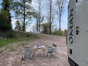 Und dann ist er gefunden. Der neue Platz für die Nacht. Micha hatte den Platz in einer App gesehen und wir stehen mitten im Grünen an einem Feldweg mit einem tollen Ausblick.