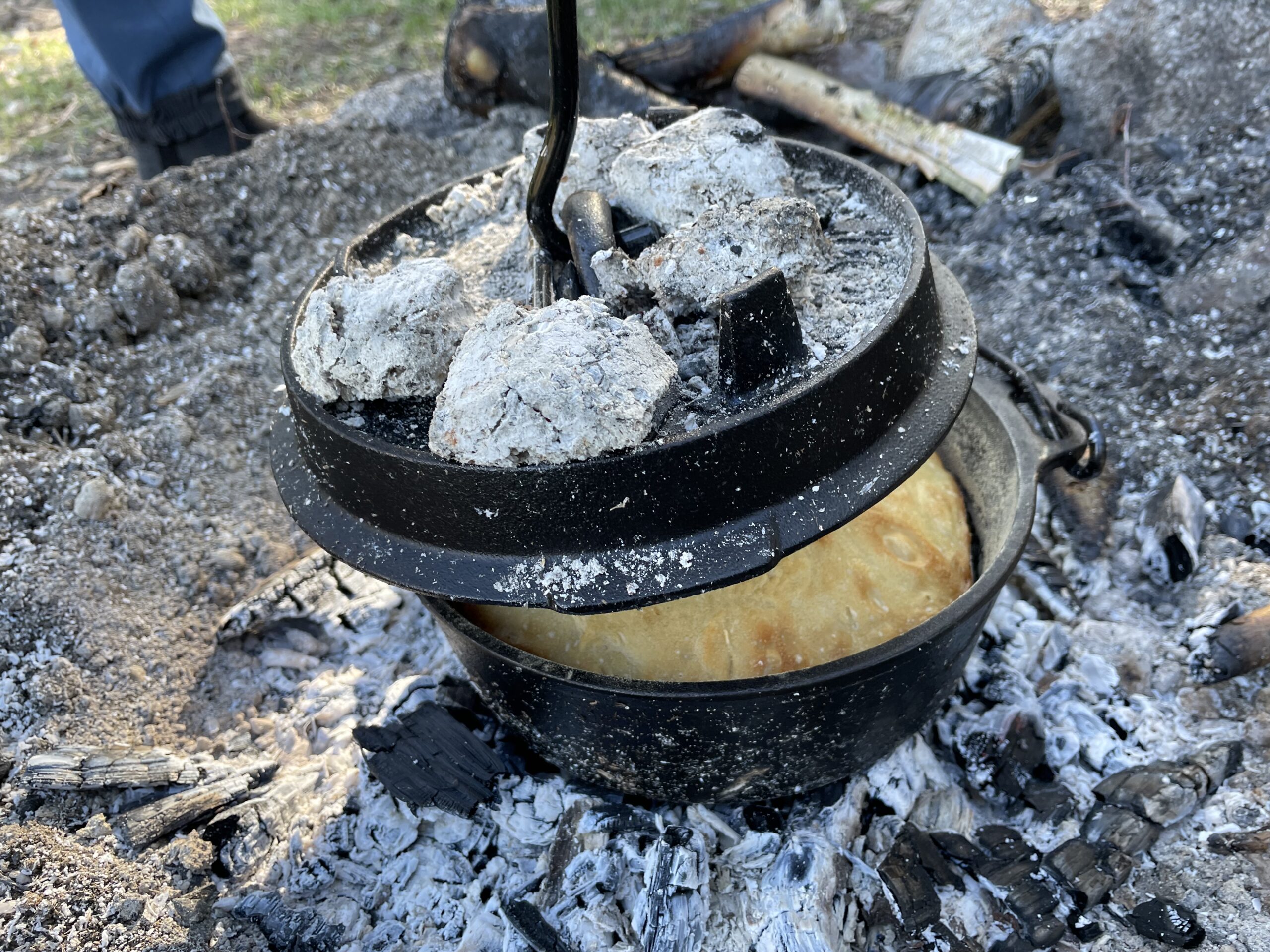 Das Brot ist gut gegangen, der Dutch wird leicht mit Mehl von innen bestäubt und rein in das Feuer.