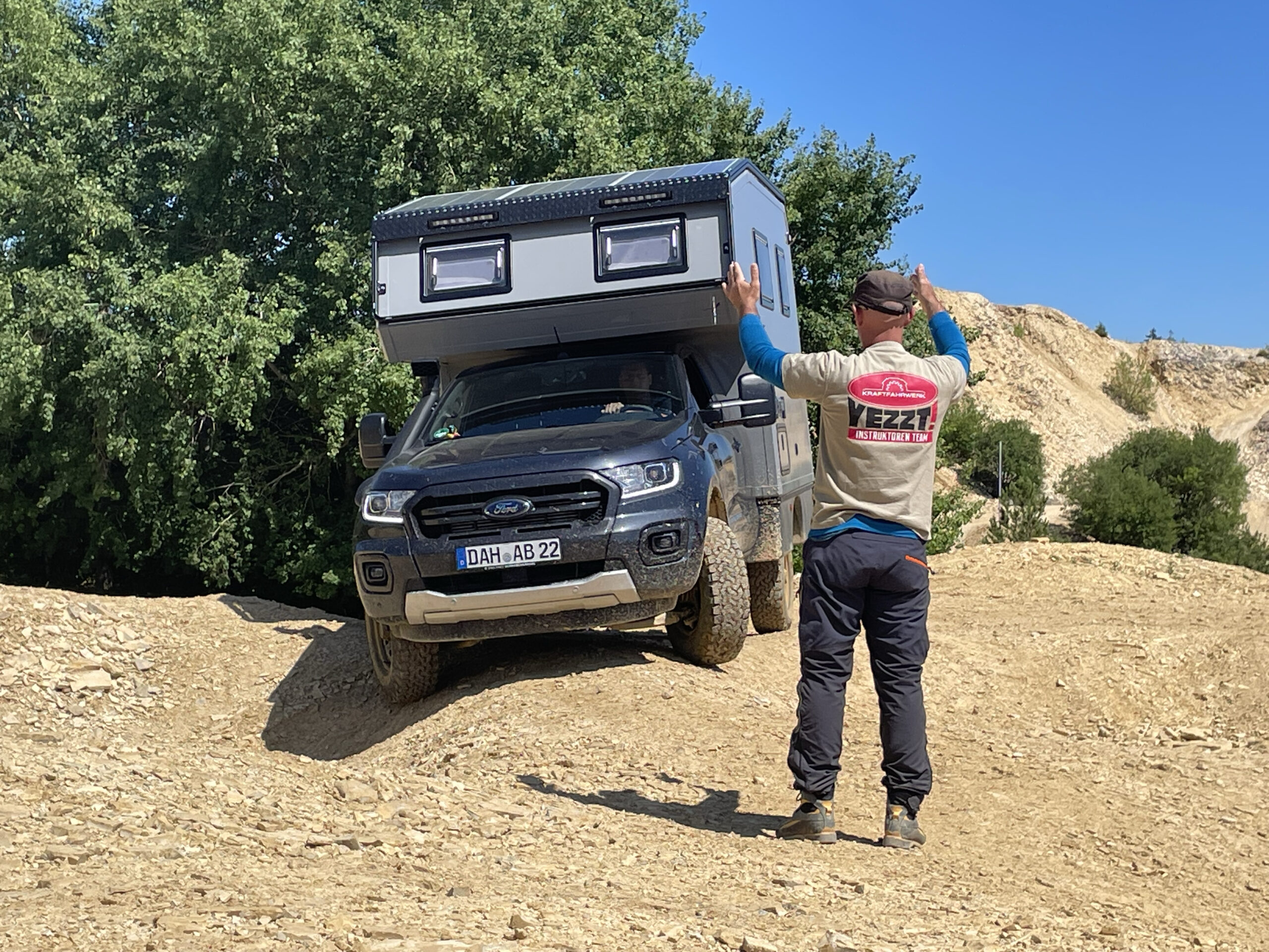 Natürlich gab es die obligatorische Einweisung und Belehrung. Im Gelände fahren wir langsam. Mit Untersetzung in ersten oder zweiten Gang. Viel Fahrtwind wird uns heute nicht um die Nase wehen. Dafür können wir die Fenster auflassen, bis der Schlamm spritzt.