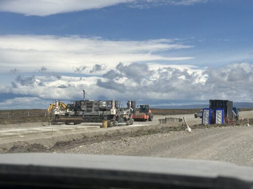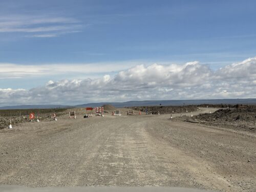Es geht von der Y-635 auf die Y-71. Eine große, breite Piste. Nach einer Zeit werden wir auf eine Nebenspur geführt. Die Straße wird gerade neu gebaut. Von Schotter auf Beton. Die Maschine, die die Betonplatten herstellt, ist schon beeindruckend.