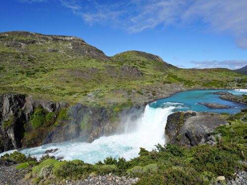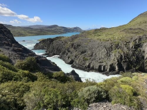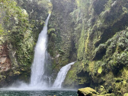 Um 9:00 Uhr brechen wir zu einer kleinen Wanderung auf. Ein Wasserfall und ein Aussichtspunkt auf die beinahe 3.000 m hohen Berge erwarten uns. Auf der Fahrt zu der Wanderung fahren wir wieder an dem türkisen See entlang, ein starker Kontrast zu dem grün der Berge. Dann sind da noch die blühenden Blumen & Sträucher am Wegesrand. Grandios.
