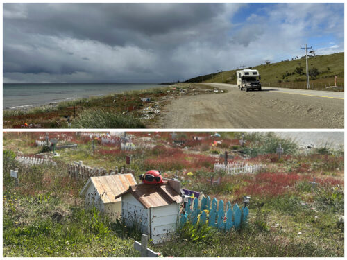 Langsam geht es Höhenmeter für Höhenmeter runter und wir fahren in die Stadt Porvenier ein. Das ist das Dritte mal auf dieser Reise, dass wir eine so vermüllte Anfahrt in die Stadt haben. Überall fliegen Tüten, Möwen kreisen über diesen Bereich und es riecht. Warum ist das hier so verdreckt und müllig und in anderen Städten gibt es keine Probleme? Warum also hier? Es entzieht sich unserer Kenntnis. Die Tankstelle am Orteingang versorgt unseren Bumba und wir fahren weiter in den Ort. Ein kleiner, bunter Spielplatz am Wasser ist zu sehen, ein Gebäude in gelb weiß im Stil eines Kolonialgebäude. Der Rest der Häuser ist schlicht und einfach. Hier ist alles sauber. Kein Müll der durch die Straßen weht. Der Müll war nur am Ortseingang. 4 km weiter liegt Bahía Chilot. Ein paar Häuser, ein großes Firmengelände und das Fährhaus und Anleger, mehr ist hier nicht.