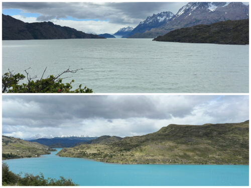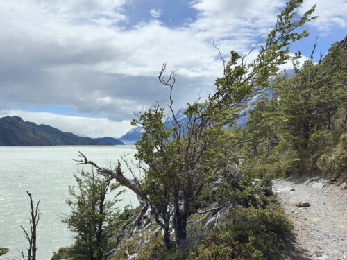 Ein kleiner aber feiner Weg. Die Aussicht auf den Gletscher ist schön, große Bruchstücke treiben im See. Dieses wunderbare türkis hebt sich von dem grauem See hab. Kein Wunder, er heißt ja auch Grey Lake. Nach einer Stunde und 40 Minuten sind wir zurück. Durchgepustet und zufrieden. Ein kurzer Stopp an dem kleinem Restaurant. Ein Blick auf die Karte. Pommes? Pommes! Micha sieht noch etwas auf der Karte und der Mitarbeiter sagt, das es sehr gut schmeckt. Wir probieren es. Und ja, es ist lecker. Wir können Quesadilla Pollo-Que nur empfehlen.