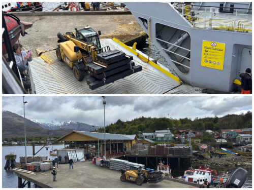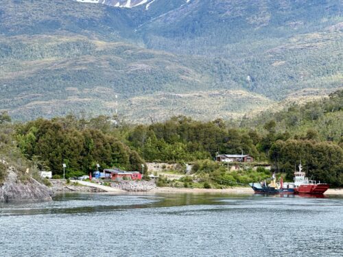Wir gelangen zu dem Zwischenziel Puerto Edén. Die Fähre hat Bohlen mit Teer getränkt geladen, die heute ihr Ziel erreichen. dWir stehen oben auf Deck und schauen uns das Spektakel an. „Die Hölzer wo er die Palette mit den Bohlen ablegen will, liegt falsch“ sagt Micha neben mir. „Das geht nicht gut, wenn er so drehen will“. Kaum hat Micha es ausgesprochen, dreht der Staplerfahrer um anders an den Abladeort zu fahren, kommt auf die Schräge der Rampe und der Stapel kippt, ein Teil der Bohlen verabschieden sich ins Meer. Jetzt schillert es hier blau, lila, grün und gelb. Einige Bohlen treiben langsam vom Kai ab, der Strömung folgend und hinterlassen ihre Spuren. Es kommt auch keiner, der einen Ring um das verschmutzte Wasser legt und Bindemittel verstreut. Dafür kommt ein Mann im Boot und fängt zwei Bohlen ein und zieht sie hinter sich her an Land.