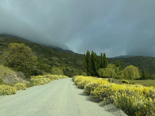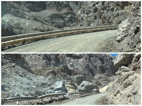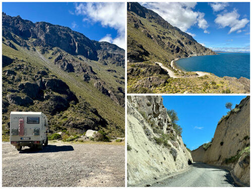 Hier gibt es relativ viel Gegenverkehr. Man sieht es hervorragend an den auf einem zukommenden Staubwolken. Radreisende kommen uns entgegen. Insgesamt sind es 6 Stück. Es muss eine beliebte Strecke sein trotz dieser schwierigen Straße. Eine Staublunge gibt es gratis dazu.