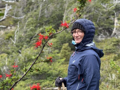 Der Weg führt durch eine Landschaft mit grünen Büschen und Gräsern. Hier und da sieht man die rot blühenden Sträucher und kleine blühende Pflanzen säumen den Weg. Wie in einem Kitschfilm, so komme ich mir vor. Als dann auch noch Guanakos zu sehen sind, ist das Bild perfekt.