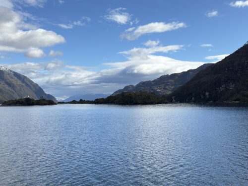 Was für eine schöne Nacht. Das Motorengeräusch der Fähre hat einen nicht gestört. Heute wird der Tag wie der Gestrige. Das macht uns aber nichts, es ist einfach wunderbar sich so treiben zu lassen. Diese Ausblicke. Sonnenstrahlen bahnen sich einen Weg durch die Wolken und strahlen mal mehr mal weniger die Berge an. Dieses warme grün, die rauhen Berge als Kontrast, das Wasser, die kleinen Abzweige in andere Fjorde. Irgendwie erwarten wir, das gleich ein Flugsaurier über uns kommt, es ist wie in dem Film Jurasic Park. Eine unglaubliche Atmosphäre herrscht hier.