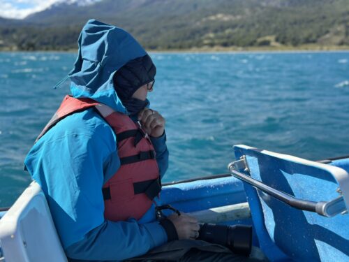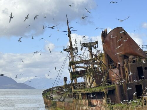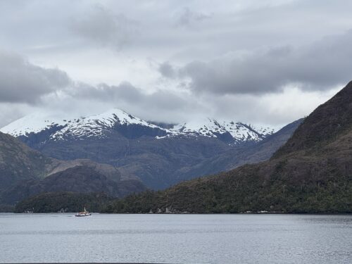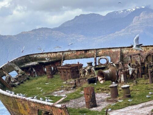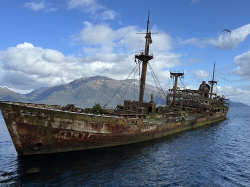 Ist das Musik? Fenster auf und ja, es ist Musik. Micha sagt sofort das wir raus müssen. Wir sind am Messier-Kanal, ein Fjord im pazifischen Ozean. Es ist einer der wichtigsten patagonischer Kanäle und hier liegt ein Wrack. Ein Zuckerfrachter, der gewollt auf Grund gesetzt wurde. Wie wir recherchieren war es ein Versicherungsbetrug, der schiefging.