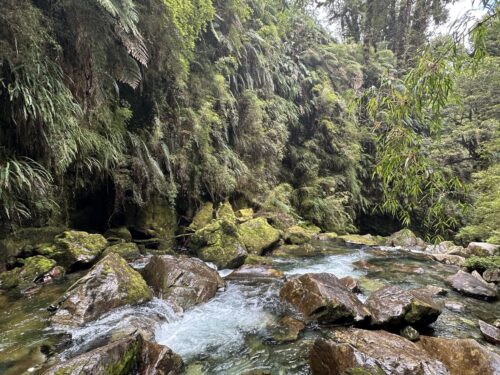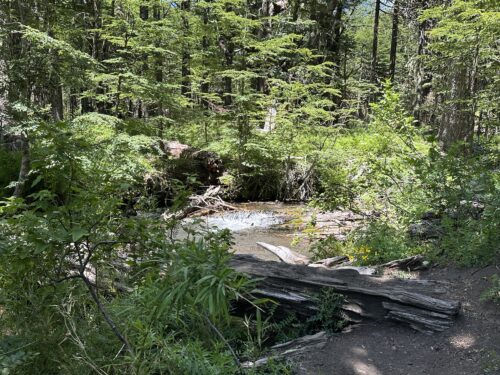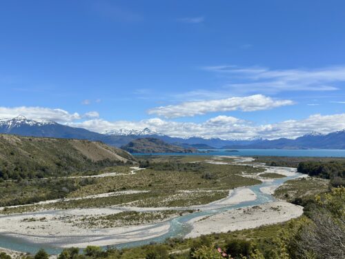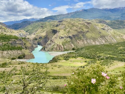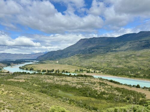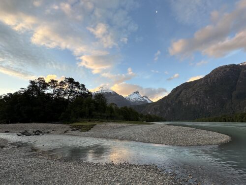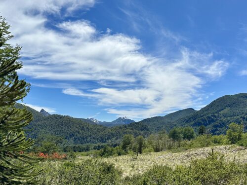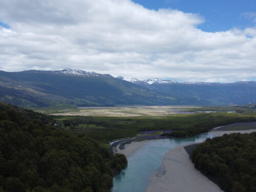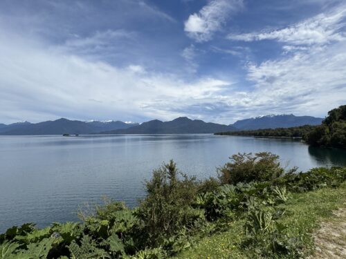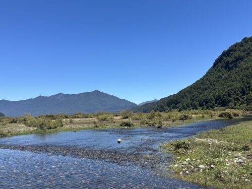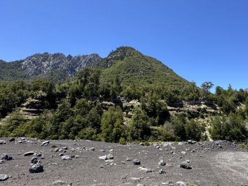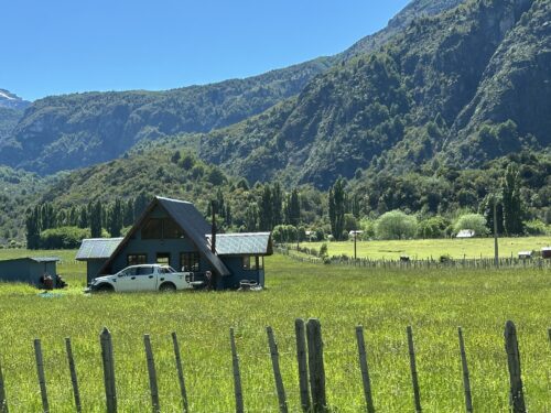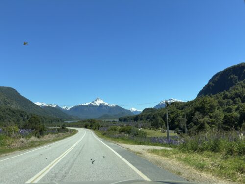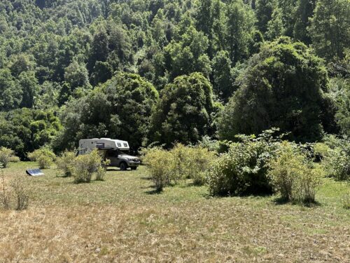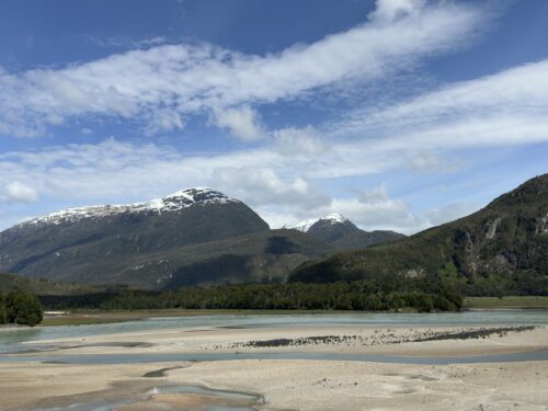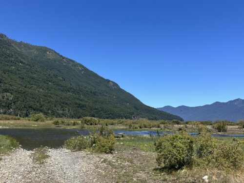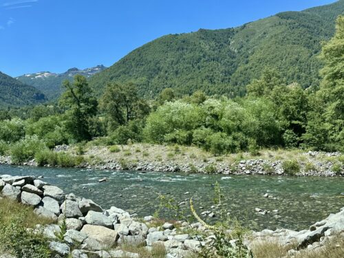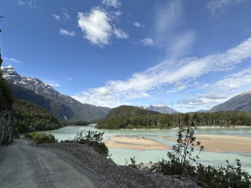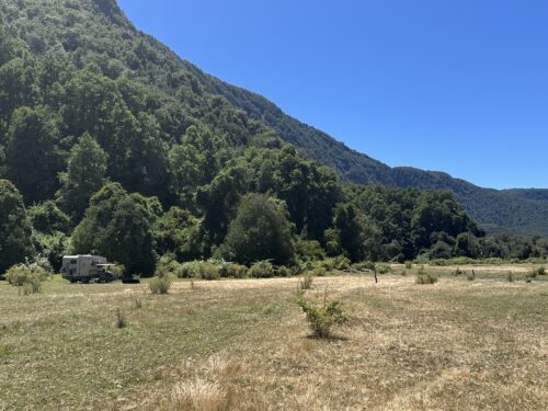 Unser Weg führt uns zurück auf die Carretera Austral 7. Die Landschaft ist einfach wunderschön. Sattes grün, rauhe Felsen, sanfte Berge. Wir fahren durch einen Wald mit riesigen Bäumen. Sie sehen für uns zumindest riesig aus, da wir lange nicht so einen Anblick hatten. Dann wieder öffnet sich der Blick auf den Fluss und die Berge.