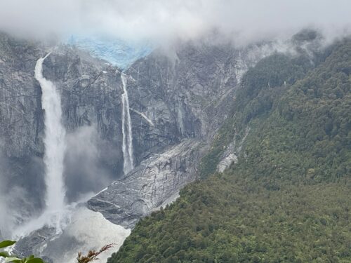 Wir sind bei der Attraktion des Park angekommen, dem „Queulat Hanging Glacier“, der durch Wolken nur einen Teil seiner Schönheit präsentiert.