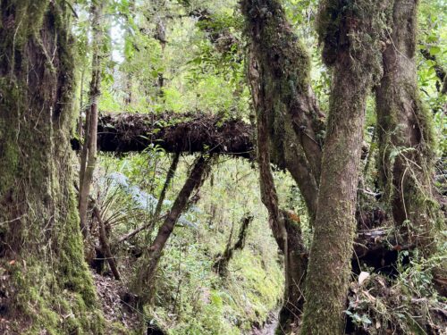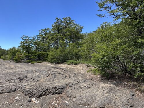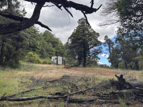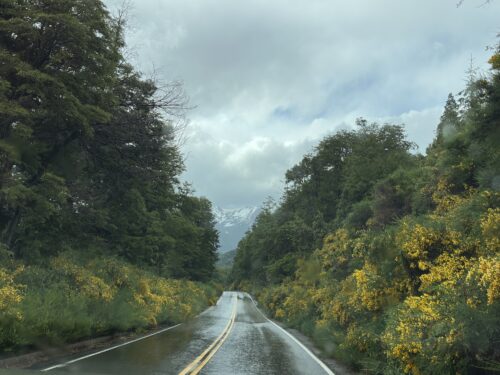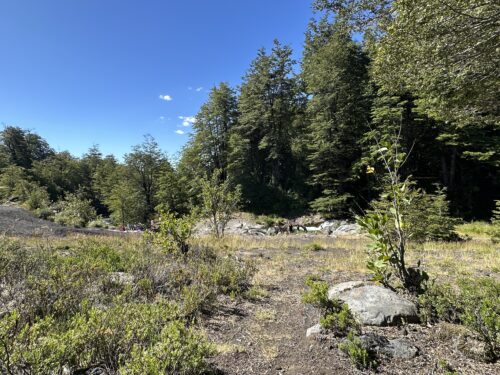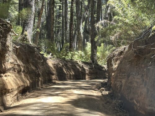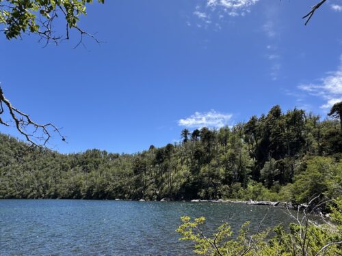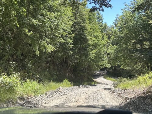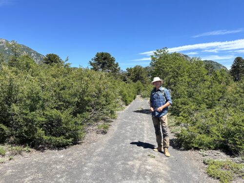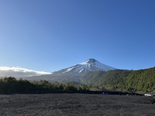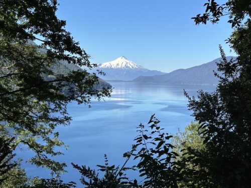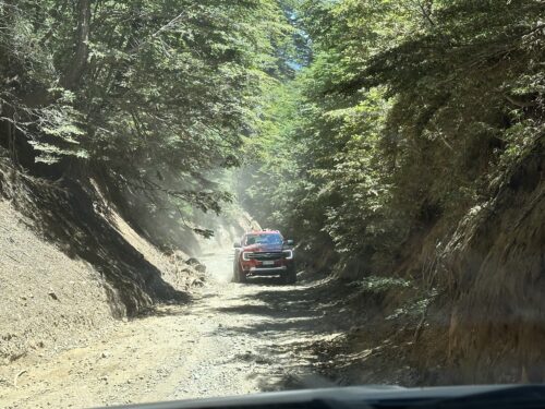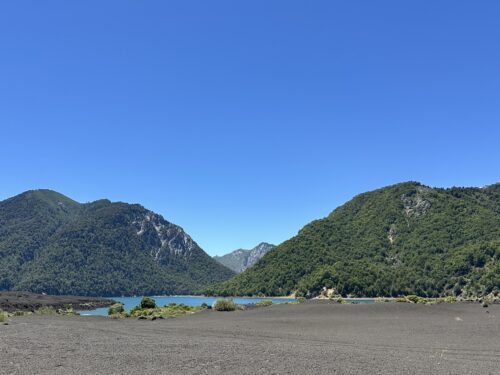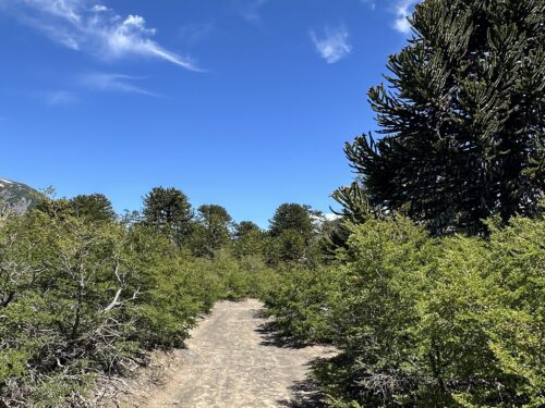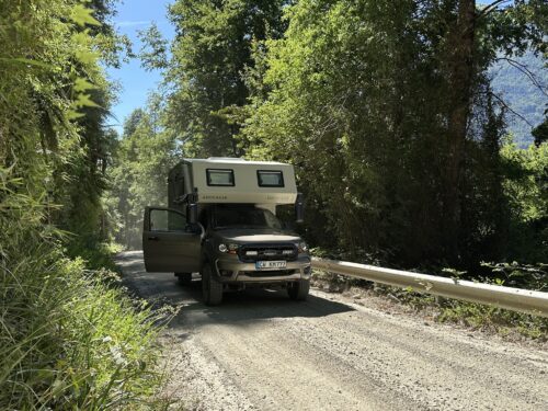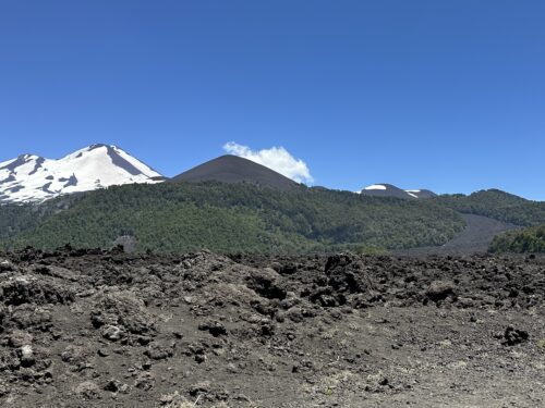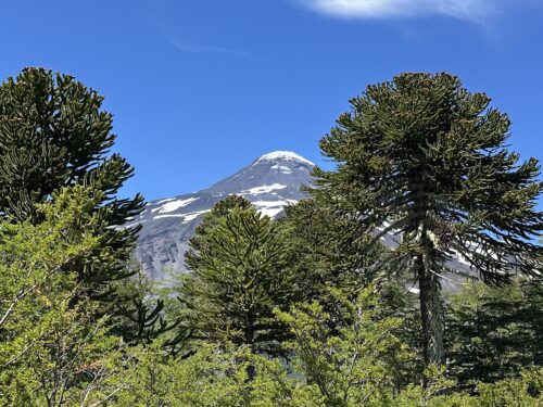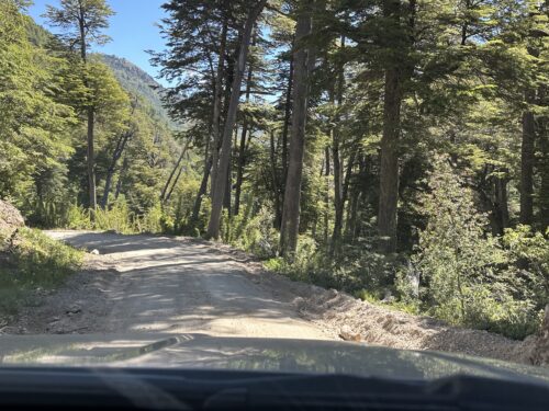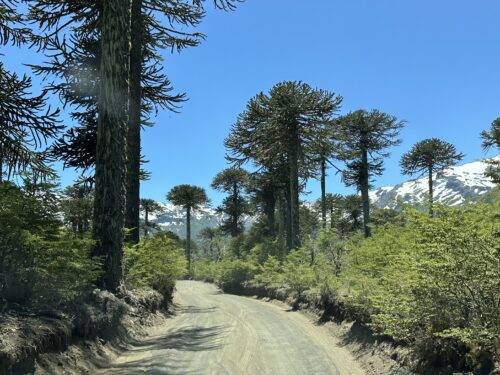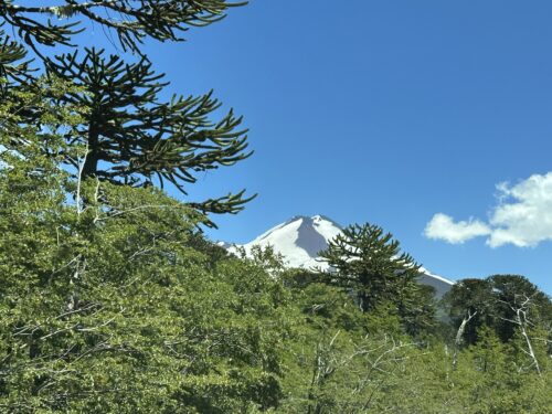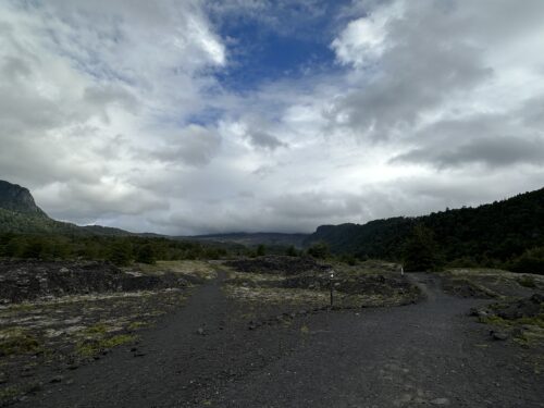 Wir fahren Richtung Norden und wollen über die nächstgelegene Grenze nach Argentinien. Die R-925-S führt durch den Nationalpark mit dem Vulkan Llaima und Sierra Nevada. Am Eingang des Parks sollen wir 30,00 € Eintritt bezahlen. Wir möchten nur durchfahren, das erläutert Micha den Rangern und eine junge Frau kommt zur Hilfe. Sie kann nicht nur Englisch, nein, sie kann sogar Deutsch. Bis 2019 hatte sie Deutsch und jetzt freut sie sich über jede Gelegenheit in Deutsch sprechen zu können. So gelingt die Verständigung noch besser und wir haben ein Zeitfenster von 1 Std. in der wir den Park durchfahren dürfen. Das Zeitfenster einzuhalten wird bei diesen Straßenverhältnissen nicht möglich sein. Wir kennen ja die Pisten mit ordentlich Wellblech, Löchern und Steinen. Jetzt kommt die nächste Challenge: Löcher und Steinbrocken in einem „Tunnel“. Links und Rechts haben wir Erde, Wurzeln, schräg hängende Bäume. Dann hat man auch mal gelegentlich Gegenverkehr. Der Park selber ist landschaftlich wieder eine Wucht. Die Lavafelder, der Lavastrom der durch die Bäume geht. Die Vegetation und dann die Seen, ach ja, und der Vulkan selbst.