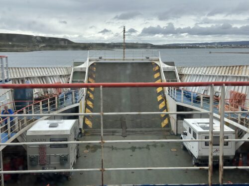 Der Wind hat sich nur etwas gelegt. Meine Hoffnung war, dass er ganz weg ist. Ob mein Kopf und Bauch das gut vertragen? Gegen 12:00 Uhr parkt Micha vom Parkplatz in die Wartespur von der Fähre. Vor uns stehen einige Fahrzeuge, in schwarz gelb gehalten und mit Nummern unten rechts an der Tür. Wir gehen mal von Taxis aus. Warum bitte stehen die hier für die Fähre? Haben die in Punto Arenas keine??? Die Fähre fährt ein und los geht das entladen. Diesmal allerdings ohne Stau auf der Spur der ankommenden Fahrzeuge. Als dann die Fußgänger kommen, setzen sie sich in die Taxis. Verstanden. Sie stehen hier auf der Spur für die Fähre, damit sie die normalen Parkplätze nicht in beschlag nehmen. Taxi für Taxi fährt und von Position 3 ist man auf einmal wieder auf der Polposition.