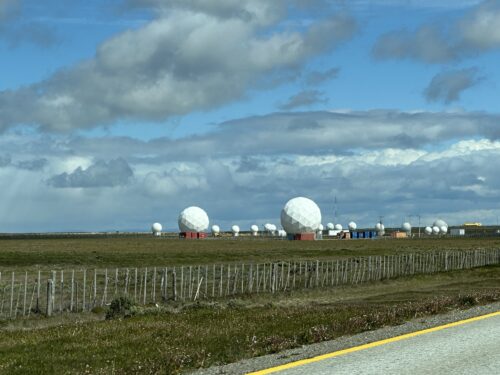 Am Wegesrand sehen wir noch große weiße Gebäude, die wie überdimensionale Golfbälle aussehen. Wofür sie sind, habe ich nicht recherchieren können. Das ist so wie mit diesen gelben, runden Dingern, die an Bäumen direkt an den Ästen / Rinde wachsen und ich einfach nicht finde, was es ist.
