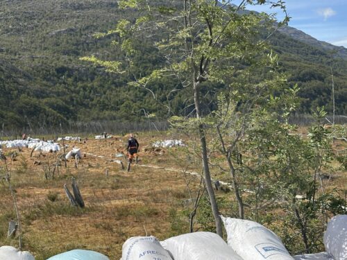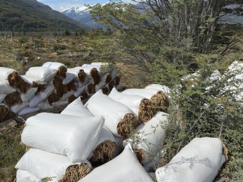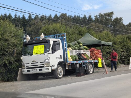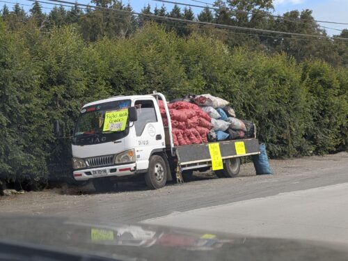 Die Straße ist eine Piste, soll sich aber später ändern und Asphalt werden. Hier staubt es ordentlich. Am Rand der Straße liegen große Säcke. Irgendwas pflanzliches lugt daraus. Wir sehen Männer die etwas ernten. Mit Gummistiefeln laufen sie teilweise auf Pfaden bzw. Bohlen die auf der Erde liegen. Für mich sieht es hier nach Moor aus. Ein Chilene legt gerade einen Sack ab und Micha bremst. Trotz Hände und Füße wissen wir 5 min. später immer noch nicht, was es ist. Bei unserer Onlinesuche finden wir leider auch nichts.