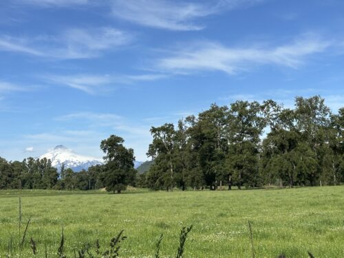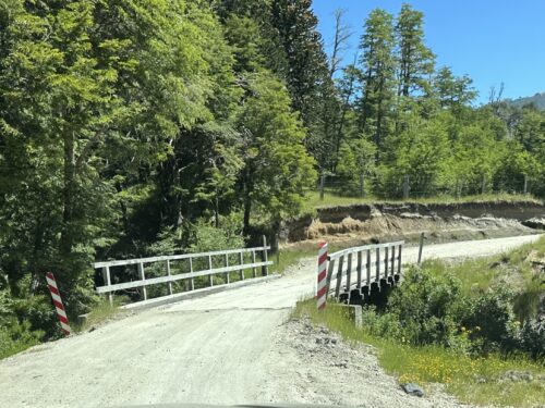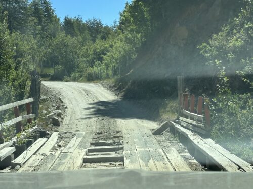 Wir fahren die Rutas – 965. Micha hatte diese Straße gewählt, da es zu unserem erwählten Stellplatz der kürzere Weg ist. Das Navi will einen ziemlichen Bogen fahren. Luftdruck runter und los geht es. Die Piste ist schlecht, die Aussicht grandios. Neben der Straße fließt ein Bergfluss, Felder und Wiesen grenzen an ihn. Verteilt stehen Häuser in dem Tal. Wunderbar. Wir sehen auch den Nevados de Sollipulli. Ein großer grauer Berg mit Schneefeldern. Die Fahrt geht über Brücken unterschiedlichster Beschaffenheit und die Piste gibt alles. Die kleinen Durchfahrten im Dorf verschaffen eine kurze Pause. Diese sind asphaltiert.