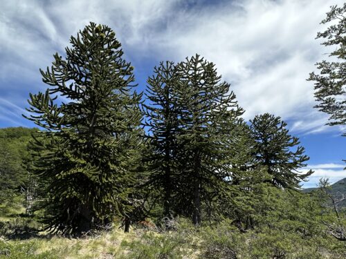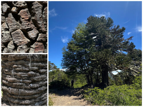 Die kleine Zufahrt zu dem Platz an dem wir eventuell eine Nacht verbringen wollen, ist sehr holperig. Schwankend kommen wir am Platz an. Schuhe an und ab zu der Lagune Huinfiuca. Der Weg führt uns durch verschiedene Vegetationen. Die chilenischen Araukarie fanden wir Beide sehr beeindruckend und haben diesen Baum gründlich erforscht. Wenn es soviele Samenkappseln gibt, warum wachsen hier nur vereinzelte Araularie? 5 Minuten später sehen wir in einem Wald von Araukarien. Die Rinden von den alten Bäumen sind wunderschön und anders als die Rinden, die ich kenne.