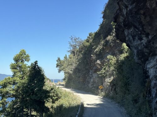 Wir reiten die S-75 weiter. Die Straße verändert sich vom Straßenbelag nicht, dafür die Aussicht. Die Straße führt am Lago Colico vorbei, mit Blick auf den Vulkan