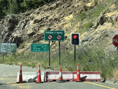 Über den Pass Pino Hachado (1.885 hm) fahren wir zu dem Tunnel „Salida Tunel de las raíces“ fahren. Ein einspuriger Tunnel, Maut ist in bar zu bezahlen. Aber wo? Einmal aussteigen und in das Haus schauen, ob ich da etwas finde. Nein, nichts. Ein jungerMann sitzt mit einer Kühltruhe vor dem Haus. Ich frage ihn ob er englisch spricht, leider nicht, und frage ihn dann in „Zeichensprache“. Er antwortet auf spanisch und ich verstehe, dass nach dem Tunnel bezahlt wird. Wunderbar. Nach einer kleinen Wartezeit von 30 Minuten geht es durch. Eine Röhre, nicht gerade breit und Abluft oder sonstiges ist nicht zu sehen. Allerdings auf der (geschätzt) Hälfte der Strecke ein SOS.