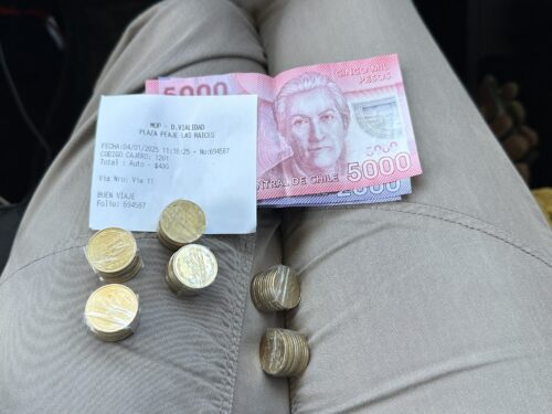 Nach der Ausfahrt des Tunnels müssen wir die Maut begleichen. $ 400 bezahle ich mit einem $ 10.000 Schein. Kleiner habe ich es nicht. Das Wechselgeld bringt uns zum Lachen. Die Münzen für $ 600 sind abgepackt. Warum auch nicht, wenn man immer das selbe brauch.