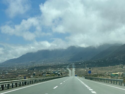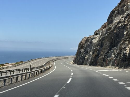 Wir fahren an der Playa entlang raus aus der Stadt. Die Straße ist gut, so dass Micha den Tempomat einstellen kann und wir gemütlich dahin rollern können. Der Wind hält sich in Grenzen, dafür regnet es. Richtiger Regen, der sogar die Windschutzscheibe von Bumba und die Seitenscheibe bei Micha reinigt. Nur bei mir ist es noch eine braune Schicht. Micha fährt bei einer Regenpause an den Rand und kommt mit dem Wassersack und einem Schwamm. „So geht das ja nicht, du kannst ja gar nichts mehr sehen“ und wäscht die Scheibe. Total lieb und ich brauche nicht mehr „Achtung, Scheibe geht auf“ sagen, damit ich ein Foto schießen kann.