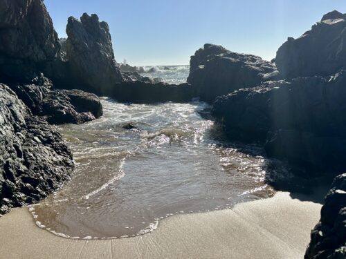 „Voll gepackt mit schönen Sachen die das Leben leichter machen….“ summen wir fröhlich als wir unseren Stellplatz anfahren. Fahrzeit noch ca. 1,5 h auf der 9 (hier wird kein A oder Y vom Navi gesagt, einfach nur 9) bis zum Ende. Man steht direkt am Meer, im Rücken den Wald, der den Wind abhält. Wunderbar. Wir staunen wie viel hier campen und hoffen, das wir unseren erkorenen Platz bekommen. Und ja, hier wollte keiner hin. Vielleicht liegt es an dem Wald? Man kann gerade mal 10 m reinschauen, dann ist da eine schwarze Wand aus Bäumen…