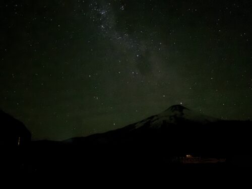 Es wird dunkel und ein Auto kommt auf den Platz gefahren, der „freundlicherweise“ den Platz mit seinen Scheinwerfern ausleuchtet. Nach 15 Minuten gehen dann die Lichter aus. Es kommt noch ein Wagen und wir fragen uns, was hier heute Nacht passiert, ob wir uns in unseren Gedanken getäuscht haben. Licht in Bumba aus und jeder liegt vor einem kleinem Fenster und schaut raus. Als Erstes fällt einem allerdings der Sternenhimmel auf. Der Himmel mit dem Vulkan als Kulisse ist umwerfend schön.