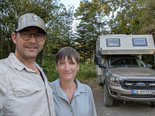 Nachdem wir einen kleinen Rundgang gemacht haben und unser Sportpensum für heute in Form von Treppensteigen erledigt haben, geht es zu unserem Übernachtungsplatz. Er befindet sich keine 15 Minuten entfernt. Die Lage ist wunderbar, nur leider sind die Bremsen nicht wunderbar. Kaum stehe ich draußen, werde ich umringt. Wie eine wilde Hilde schlage ich um mich, damit ich die Viecher erlegen kann. „Halt still“ und Micha erledigt eine Bremse, die sehr hartnäckig um meinen Kopf tanzte. Draußen sitzen? Nein, das geht für mich nicht. Ich reagiere so stark auf diese Stiche, dass ich die letzten Male über eine Woche jucken hatte und nach zwei Wochen die Stelle von dem Bis weg war.