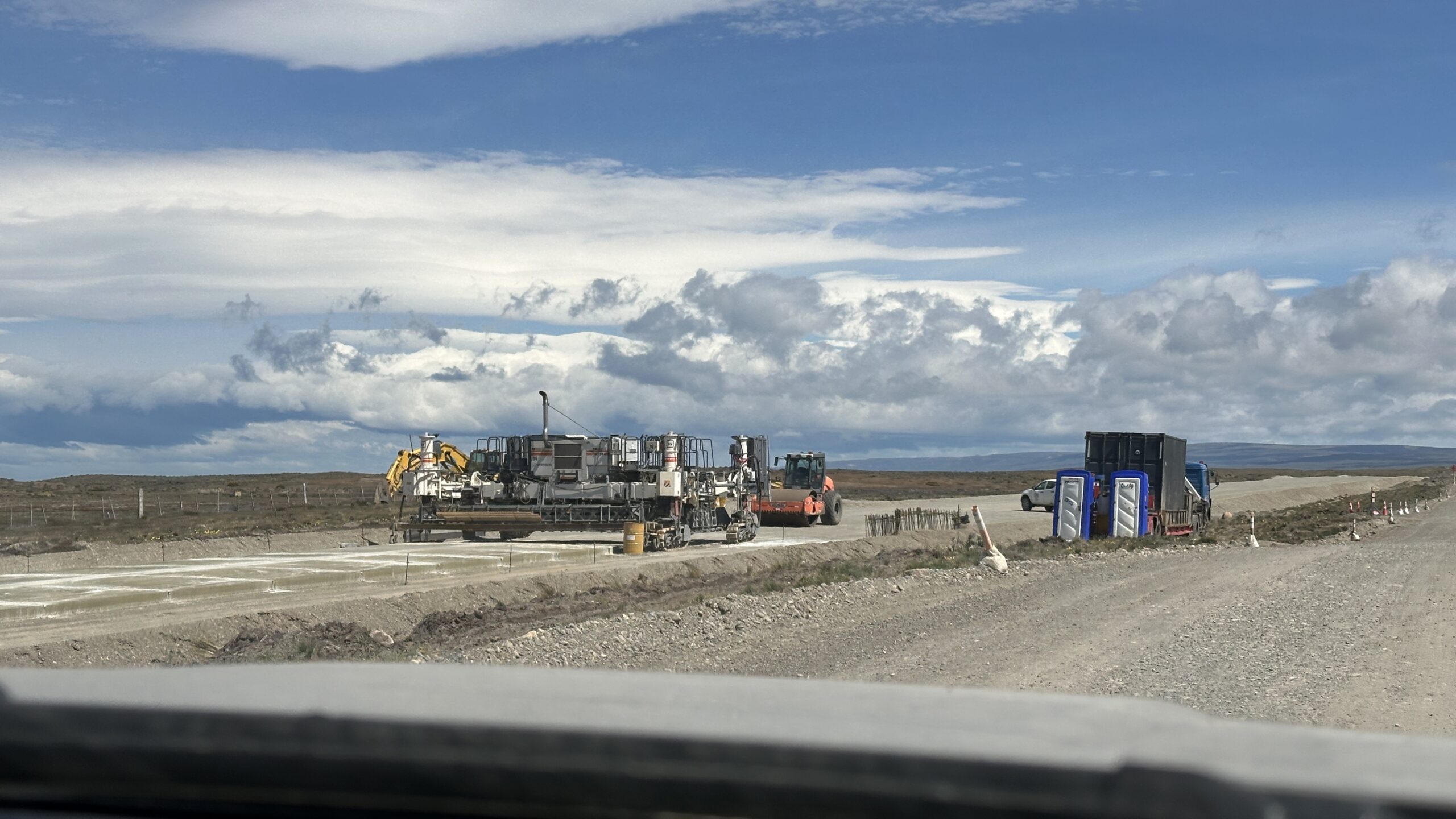 Es geht von der Y-635 auf die Y-71. Eine große, breite Piste. Nach einer Zeit werden wir auf eine Nebenspur geführt. Die Straße wird gerade neu gebaut. Von Schotter auf Beton. Die Maschine, die die Betonplatten herstellt, ist schon beeindruckend.
