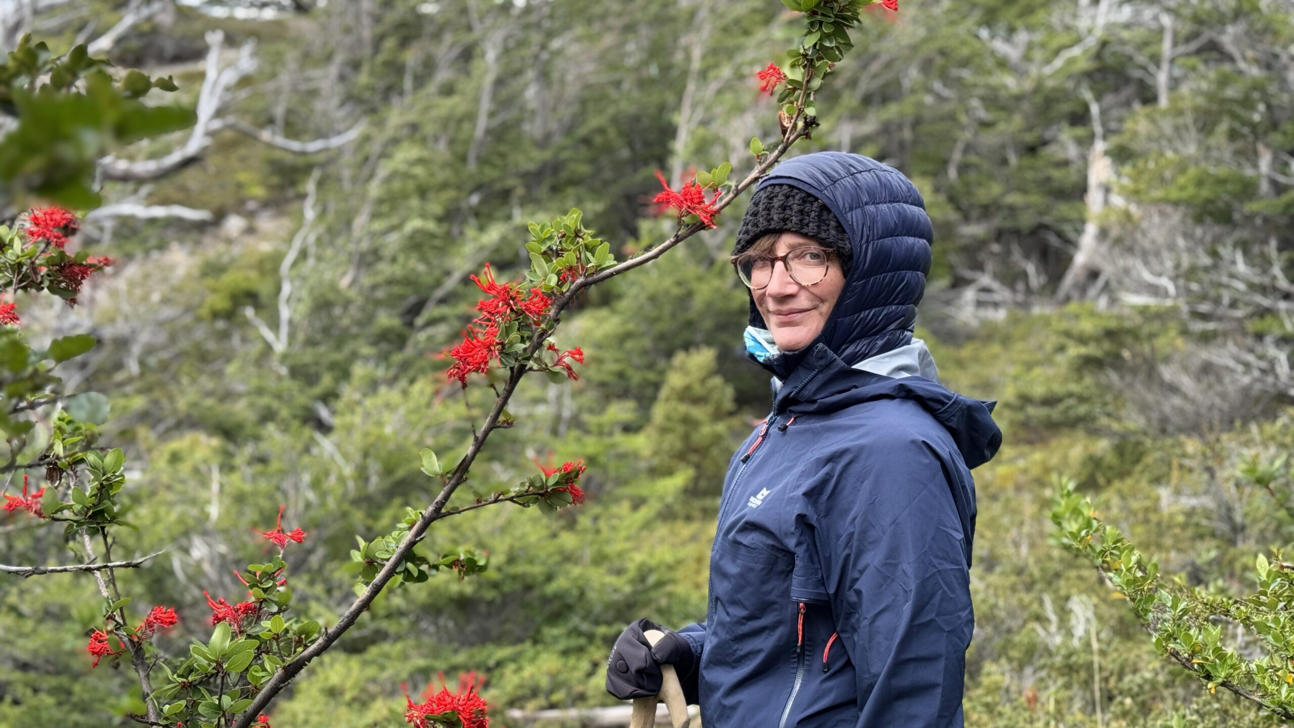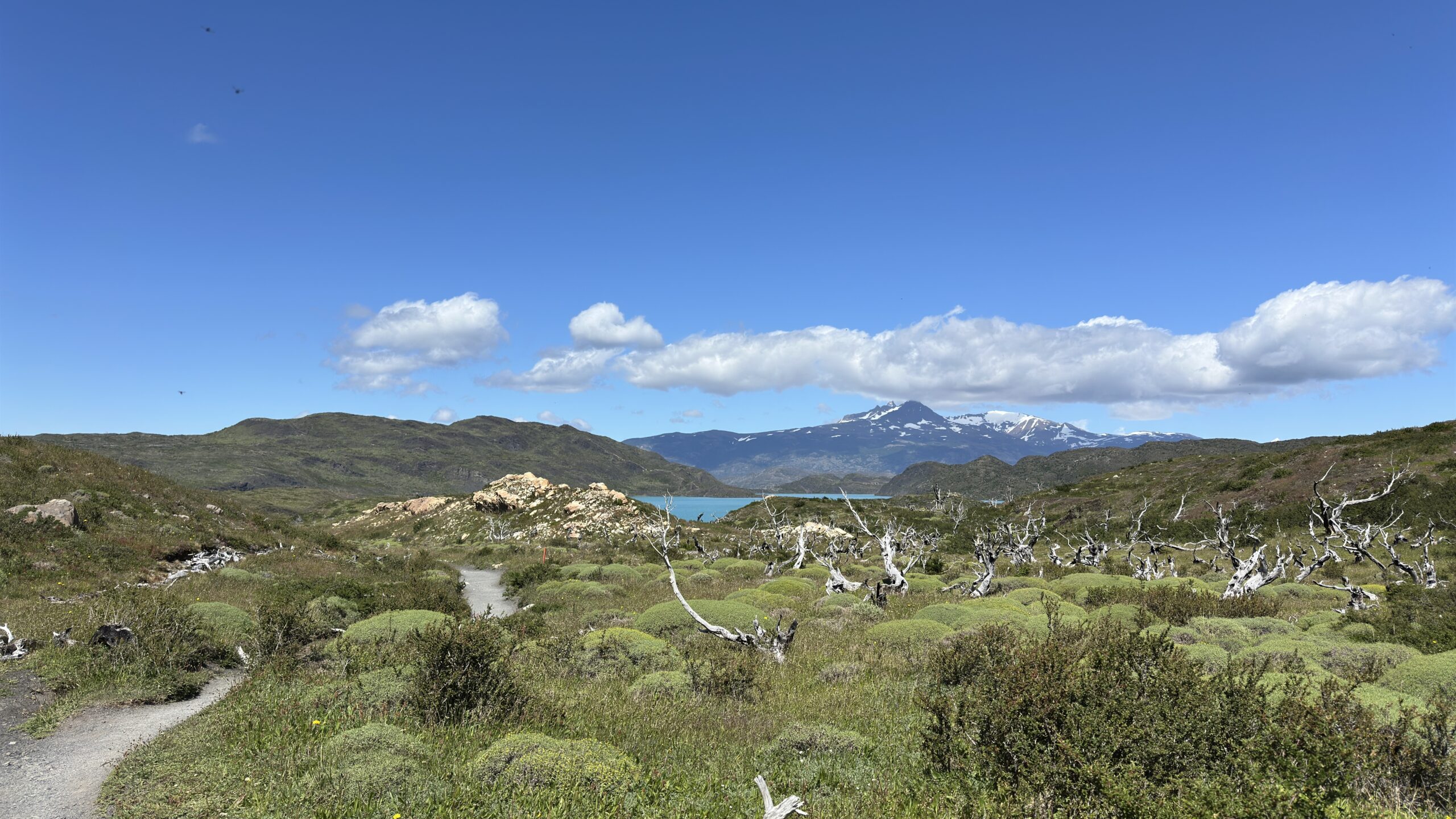 Der Weg führt durch eine Landschaft mit grünen Büschen und Gräsern. Hier und da sieht man die rot blühenden Sträucher und kleine blühende Pflanzen säumen den Weg. Wie in einem Kitschfilm, so komme ich mir vor. Als dann auch noch Guanakos zu sehen sind, ist das Bild perfekt.