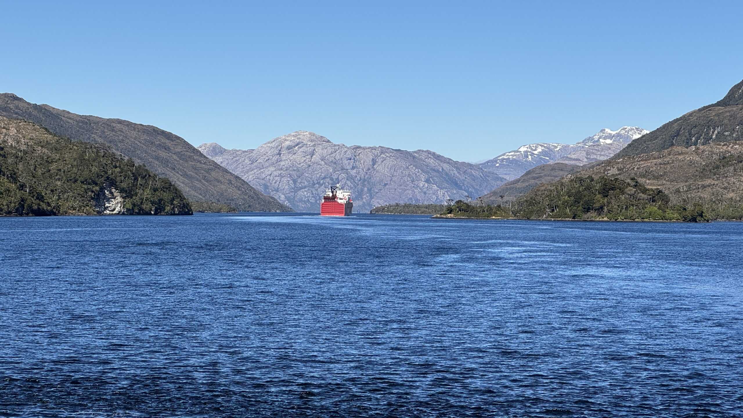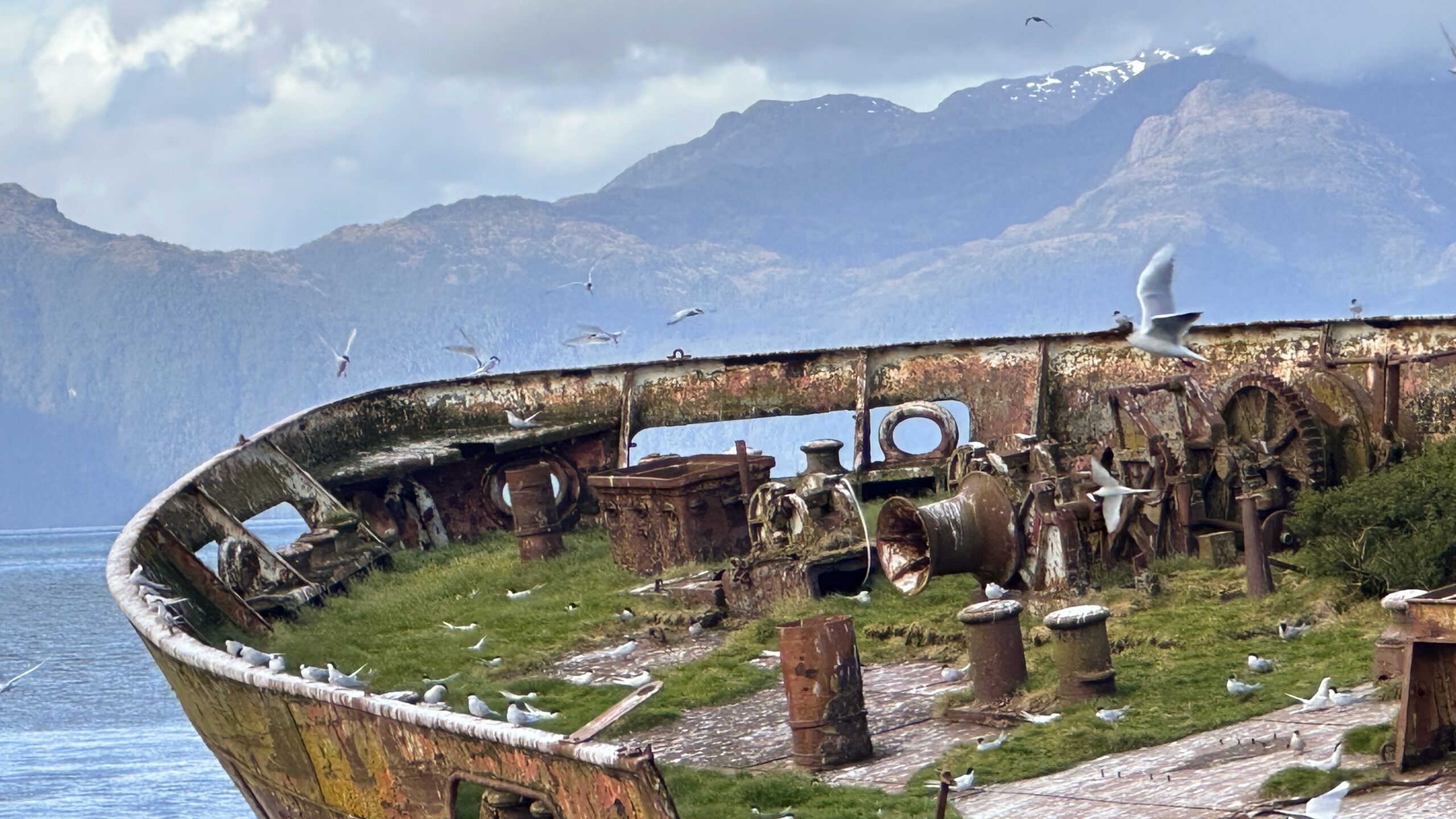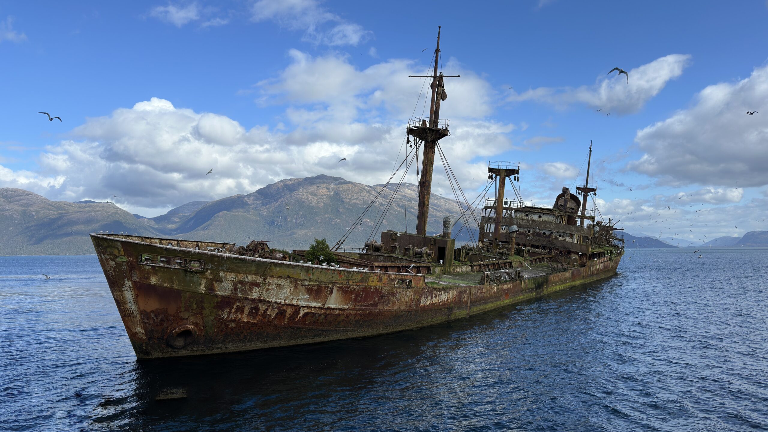 Ist das Musik? Fenster auf und ja, es ist Musik. Micha sagt sofort das wir raus müssen. Wir sind am Messier-Kanal, ein Fjord im pazifischen Ozean. Es ist einer der wichtigsten patagonischer Kanäle und hier liegt ein Wrack. Ein Zuckerfrachter, der gewollt auf Grund gesetzt wurde. Wie wir recherchieren war es ein Versicherungsbetrug, der schiefging.