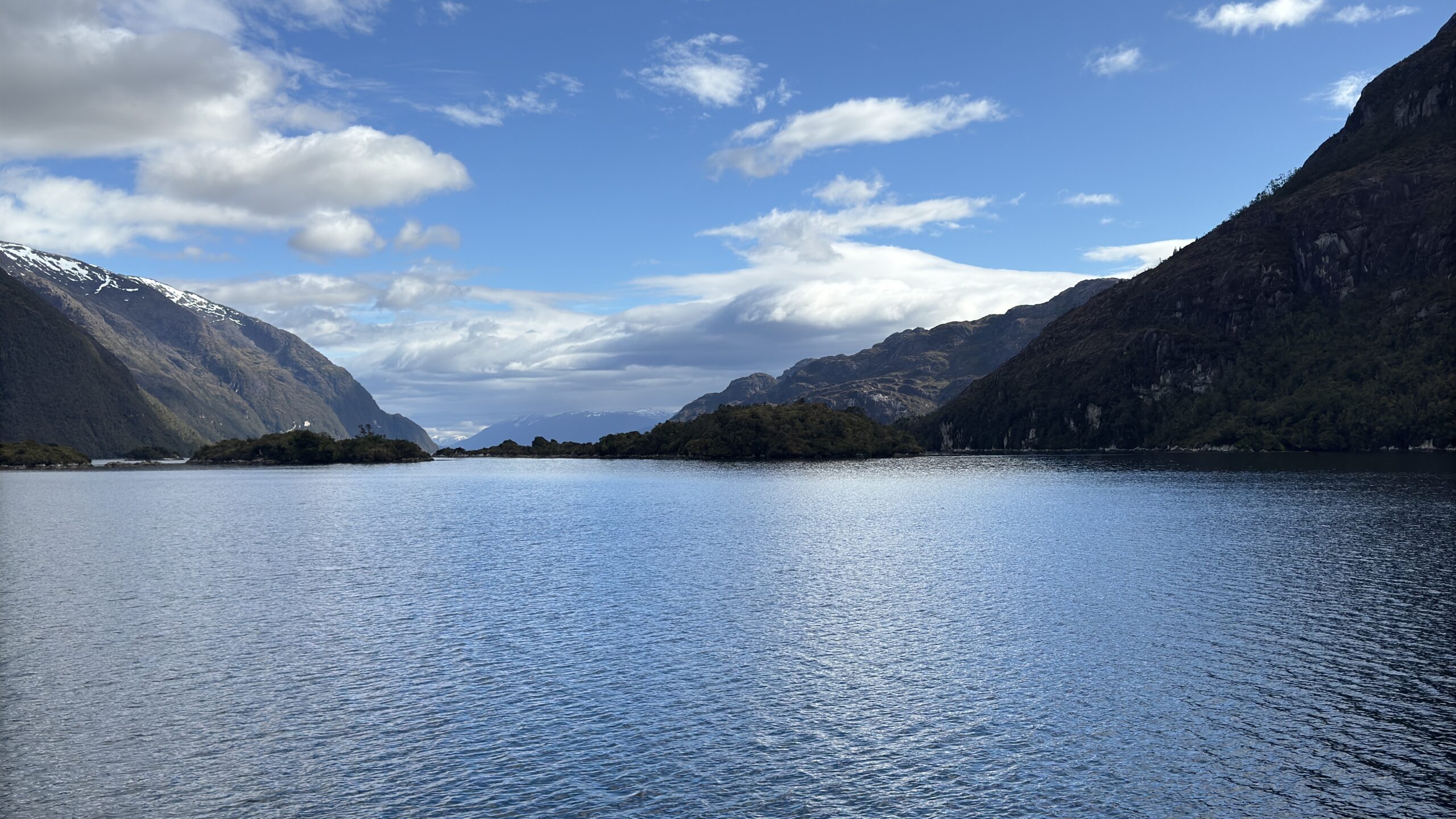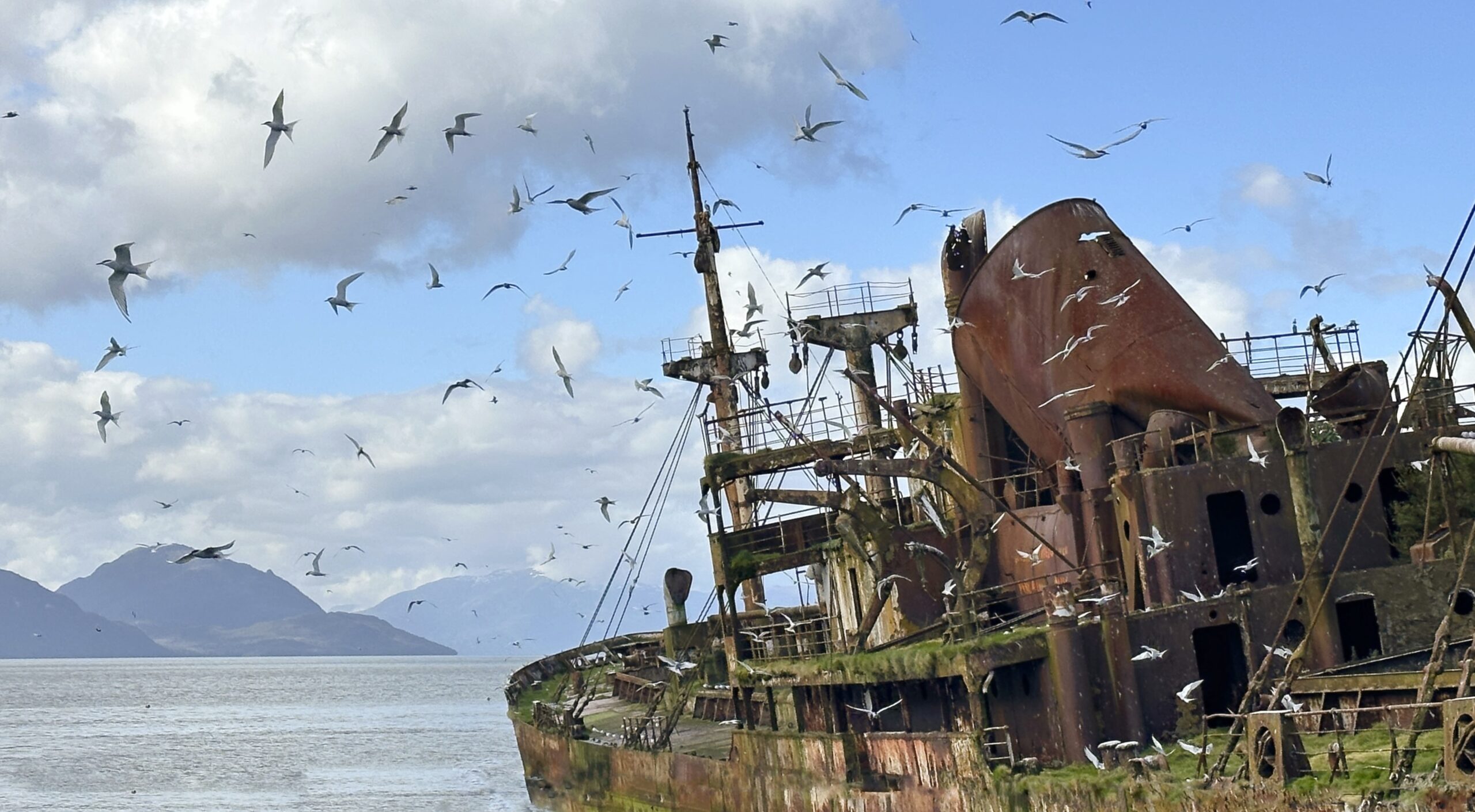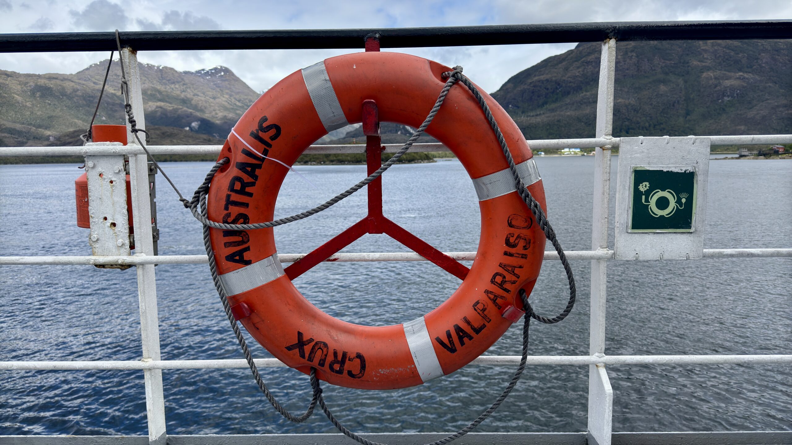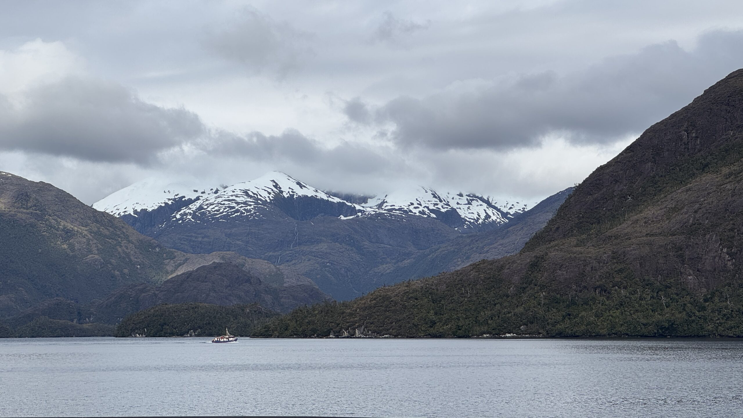 Ist das Musik? Fenster auf und ja, es ist Musik. Micha sagt sofort das wir raus müssen. Wir sind am Messier-Kanal, ein Fjord im pazifischen Ozean. Es ist einer der wichtigsten patagonischer Kanäle und hier liegt ein Wrack. Ein Zuckerfrachter, der gewollt auf Grund gesetzt wurde. Wie wir recherchieren war es ein Versicherungsbetrug, der schiefging.