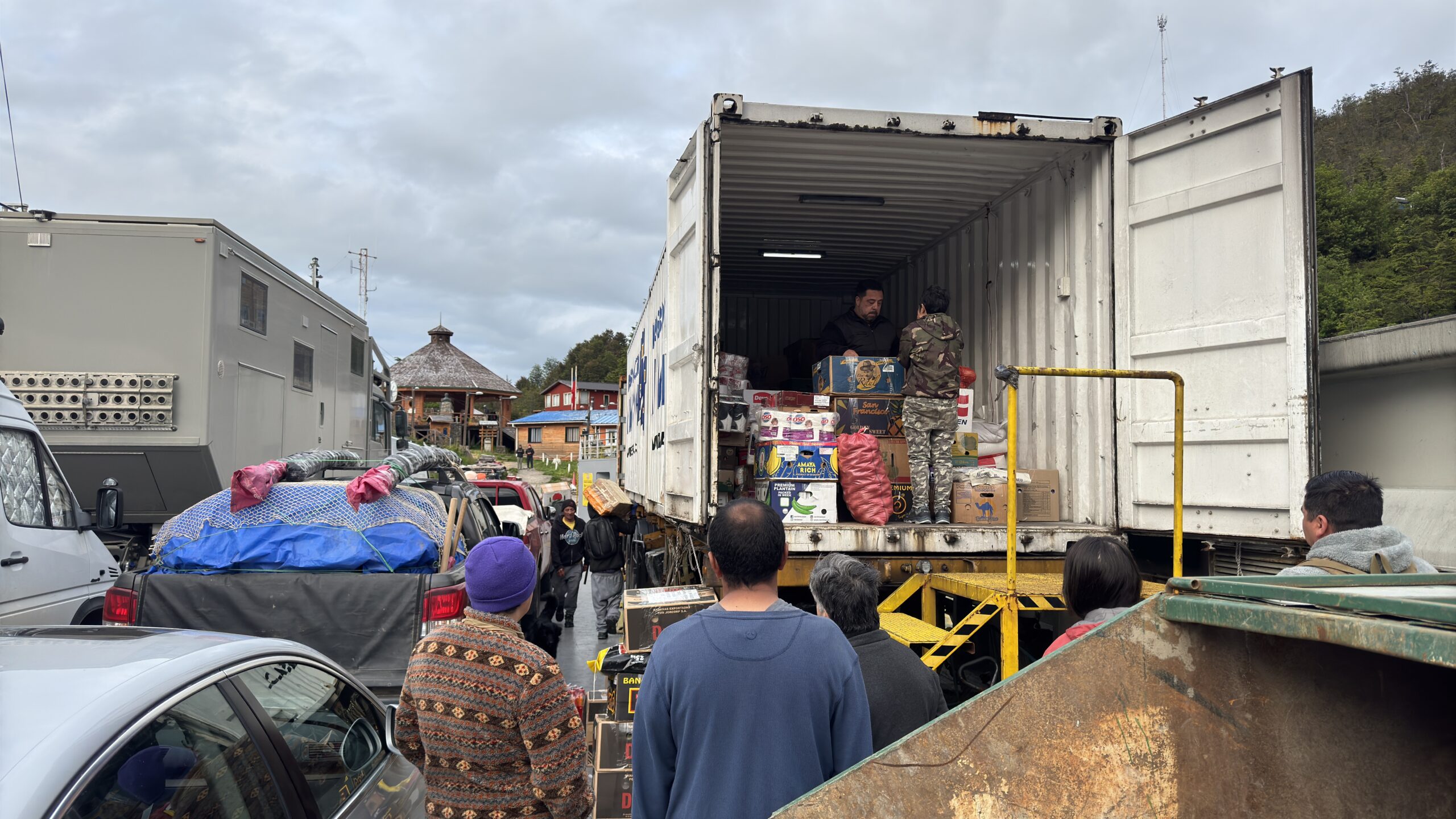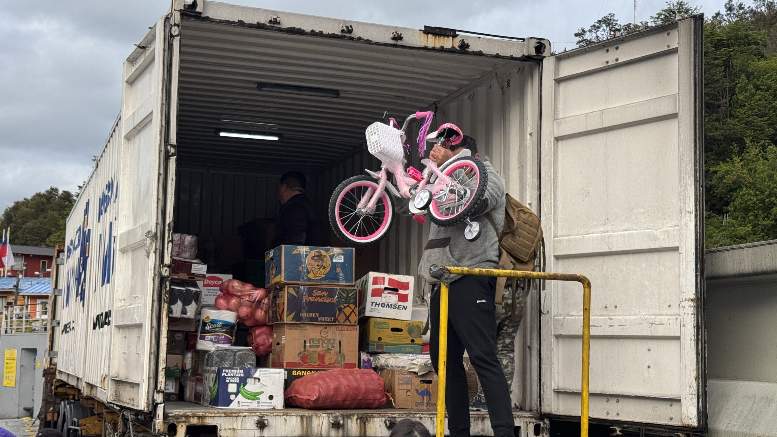 Einwohner kommen auf die Fähre und holen Pakete ab. Lebensmittel oder Baumaterial, aber auch Weihnachtsgeschenke werden abgeholt.