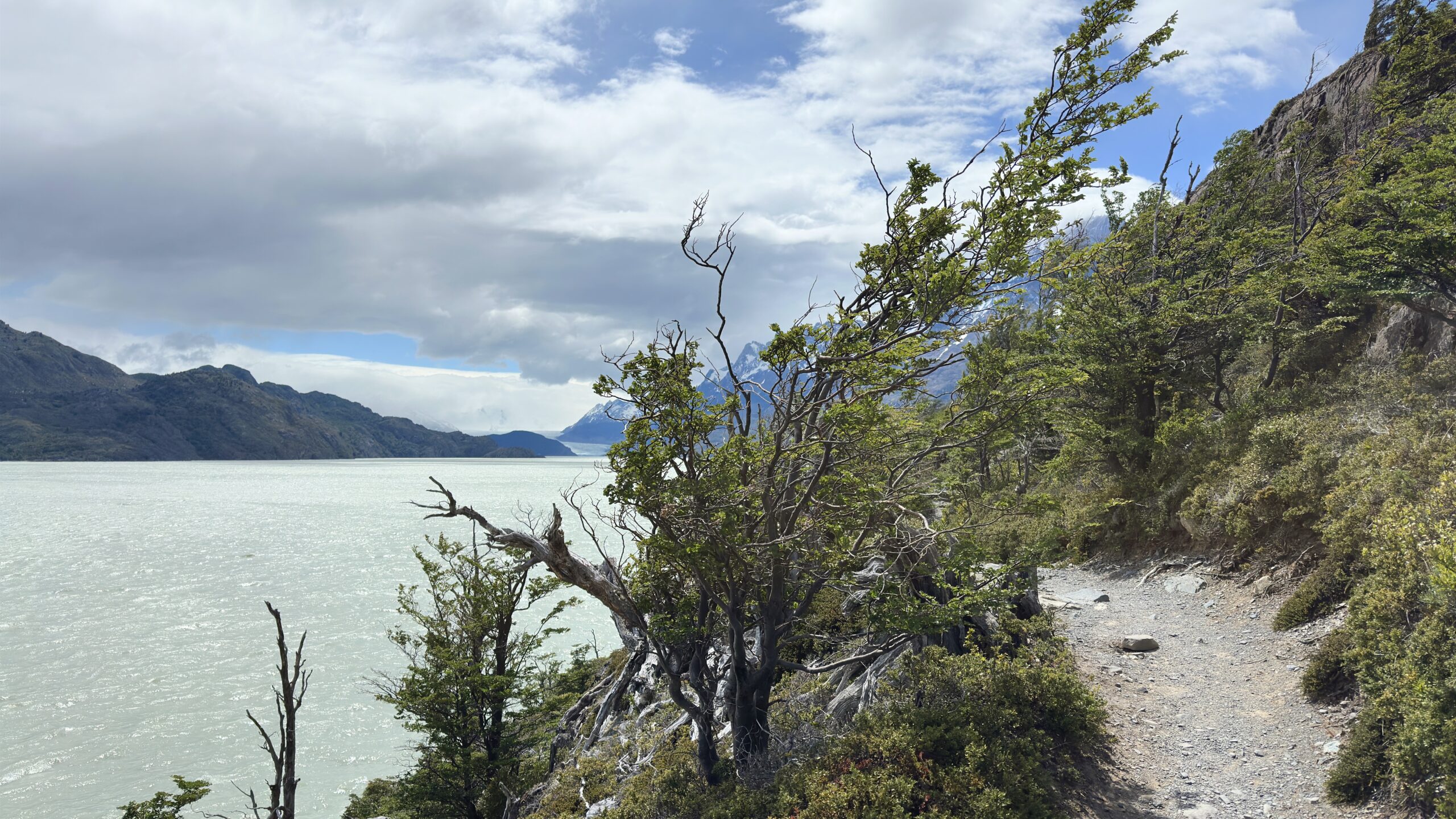 Ein kleiner aber feiner Weg. Die Aussicht auf den Gletscher ist schön, große Bruchstücke treiben im See. Dieses wunderbare türkis hebt sich von dem grauem See hab. Kein Wunder, er heißt ja auch Grey Lake. Nach einer Stunde und 40 Minuten sind wir zurück. Durchgepustet und zufrieden. Ein kurzer Stopp an dem kleinem Restaurant. Ein Blick auf die Karte. Pommes? Pommes! Micha sieht noch etwas auf der Karte und der Mitarbeiter sagt, das es sehr gut schmeckt. Wir probieren es. Und ja, es ist lecker. Wir können Quesadilla Pollo-Que nur empfehlen.