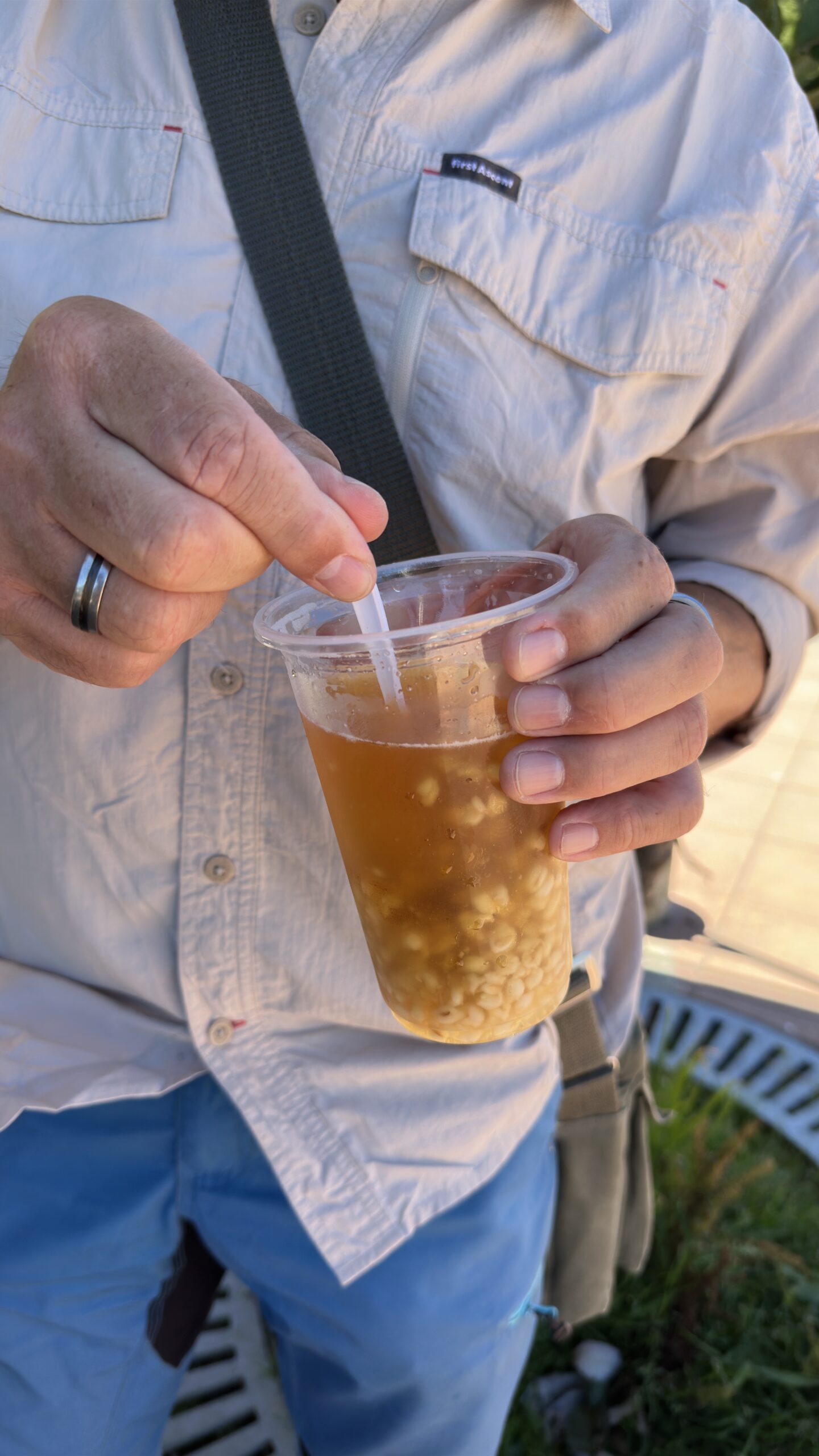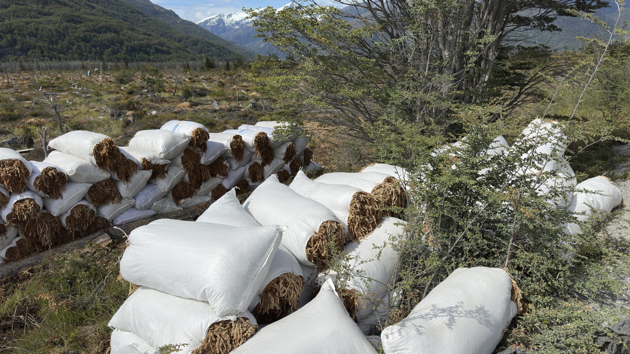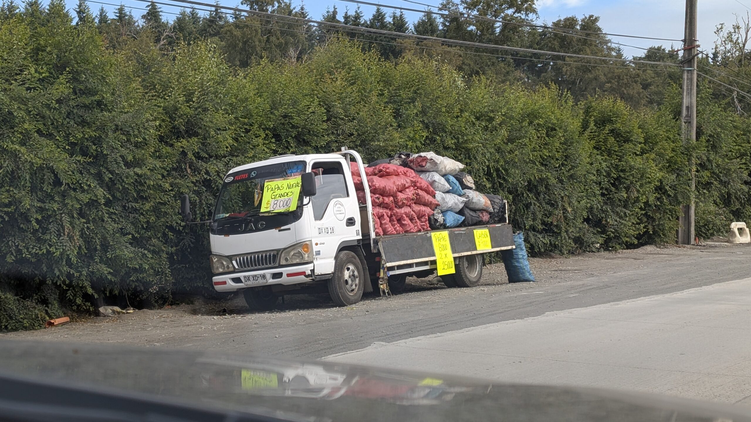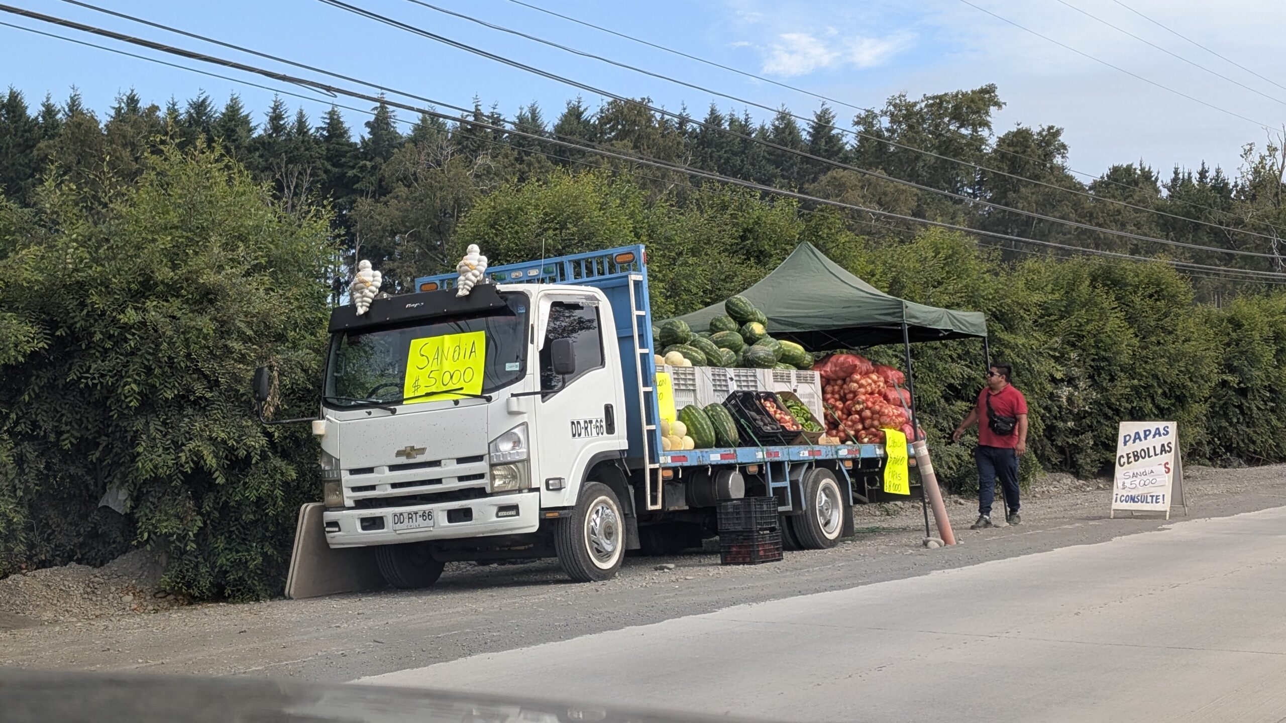 Die Straße ist eine Piste, soll sich aber später ändern und Asphalt werden. Hier staubt es ordentlich. Am Rand der Straße liegen große Säcke. Irgendwas pflanzliches lugt daraus. Wir sehen Männer die etwas ernten. Mit Gummistiefeln laufen sie teilweise auf Pfaden bzw. Bohlen die auf der Erde liegen. Für mich sieht es hier nach Moor aus. Ein Chilene legt gerade einen Sack ab und Micha bremst. Trotz Hände und Füße wissen wir 5 min. später immer noch nicht, was es ist. Bei unserer Onlinesuche finden wir leider auch nichts.