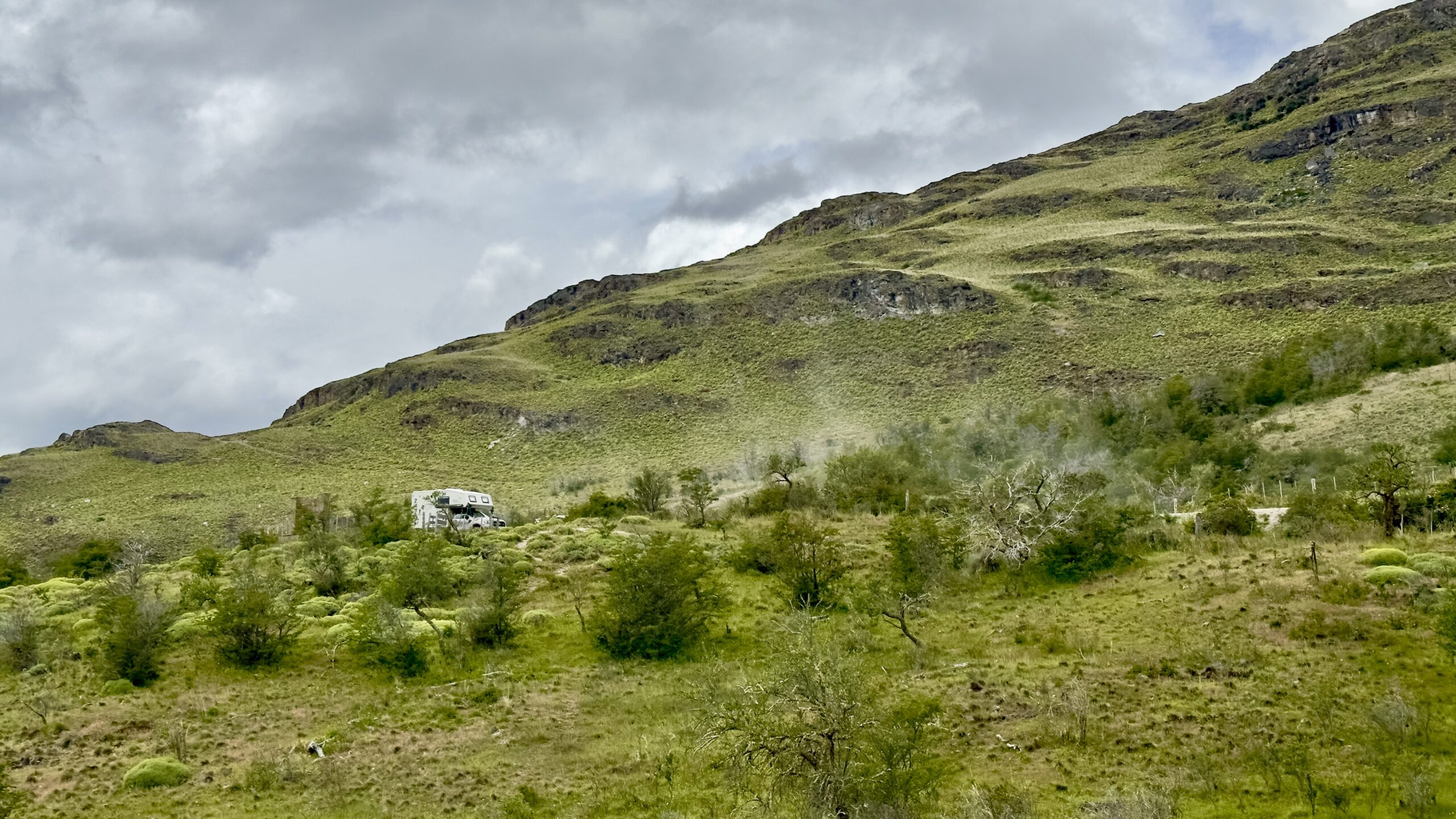 Wie gesagt, aus Chile sind wir fix ausgereist und in Argentinien eingereist. Die Straße ist eine normal Straße, führt allerdings durch einen Nationalpark, so dass hier quasi eine „Maut“ anfällt. Pro Person natürlich, für uns zum Glück mal wieder nur für eine Person. Auf der Straße liegt ein schöner Stellplatz, den wir dann nutzen. Für die bezahlte „Maut“ ist das ok.