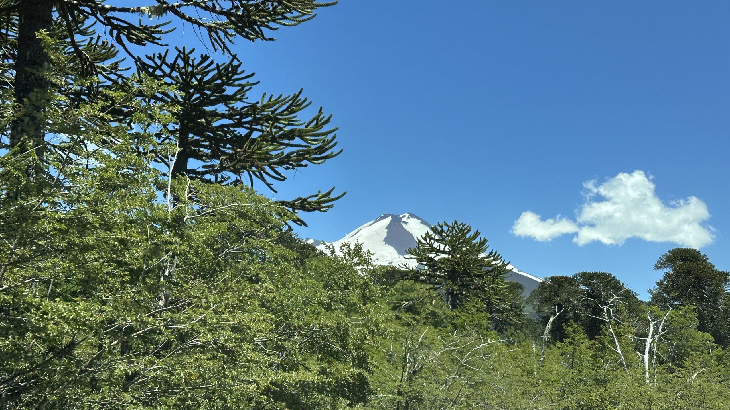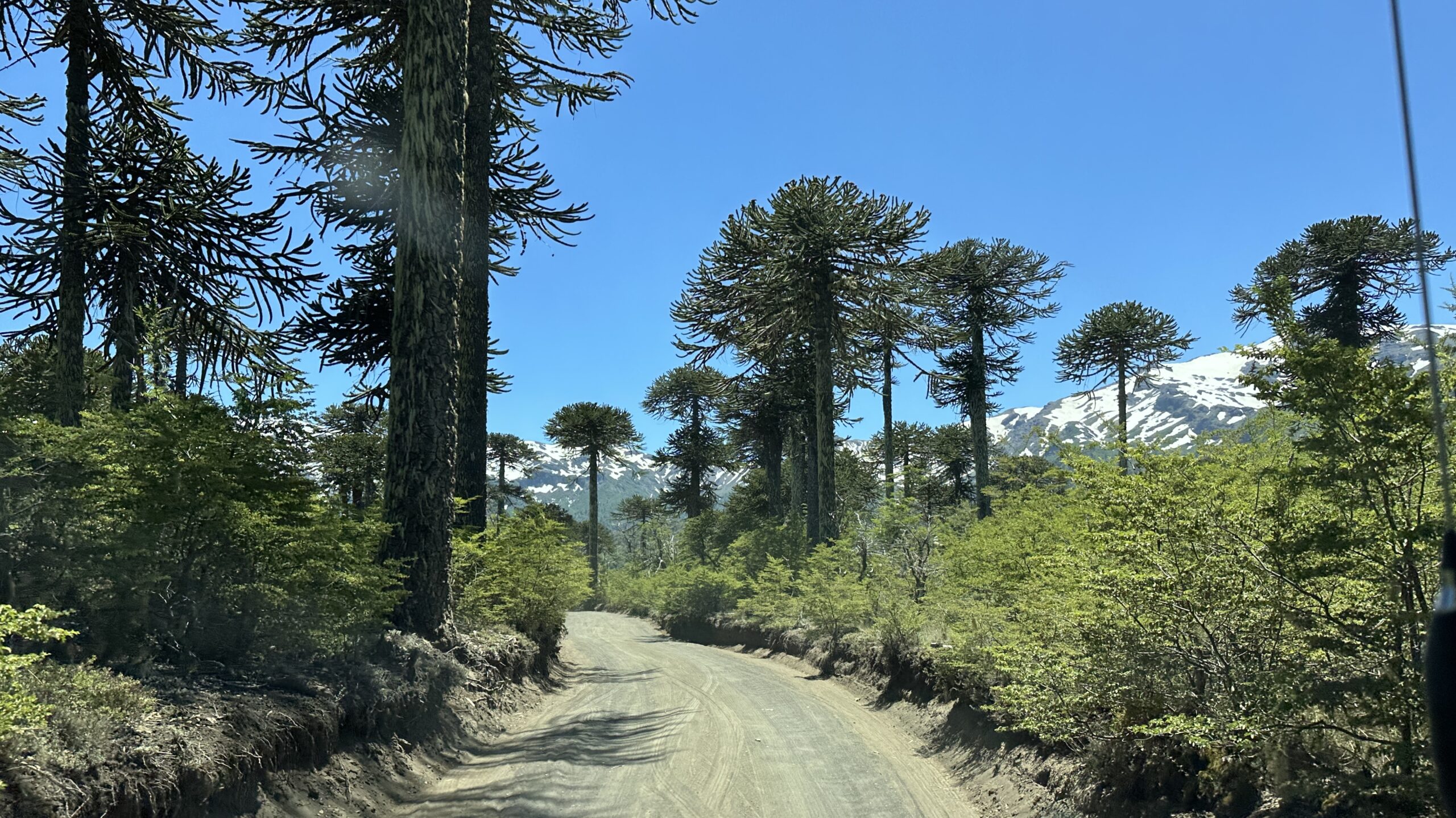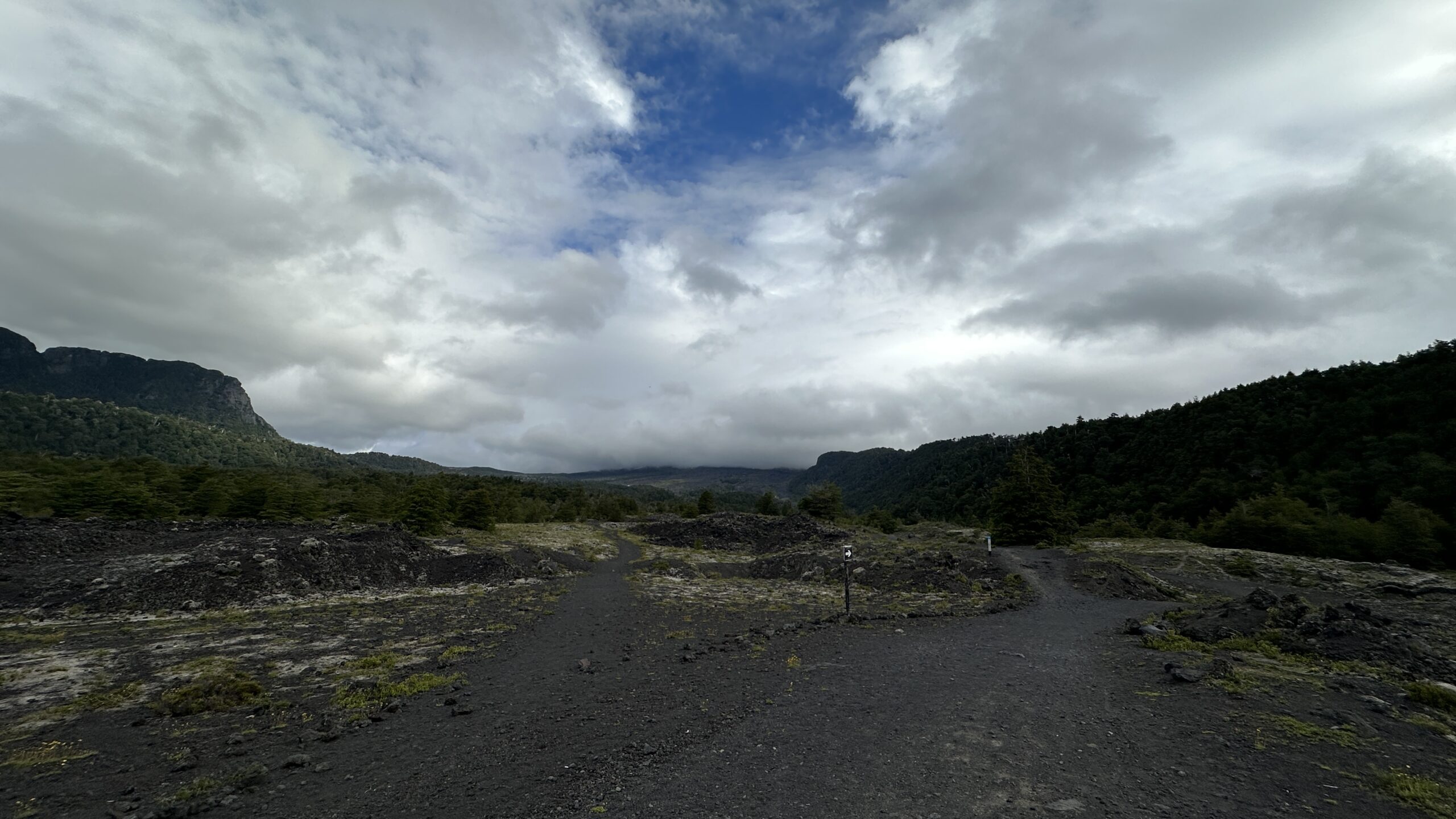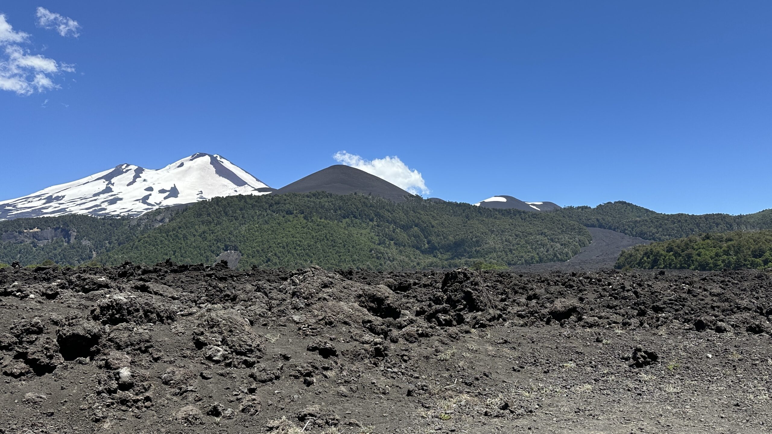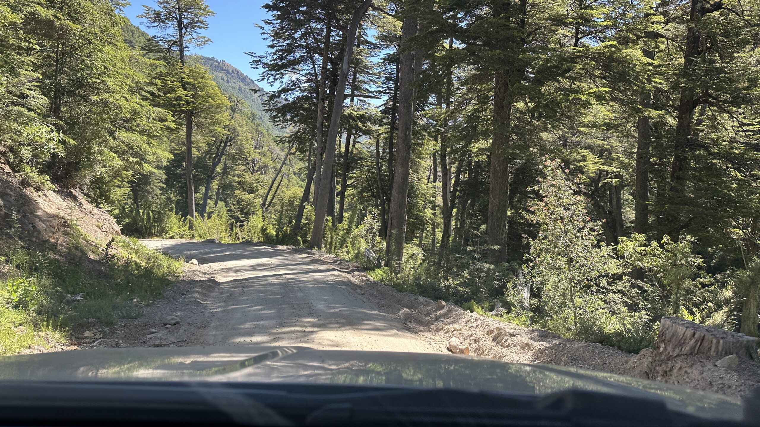 Wir fahren Richtung Norden und wollen über die nächstgelegene Grenze nach Argentinien. Die R-925-S führt durch den Nationalpark mit dem Vulkan Llaima und Sierra Nevada. Am Eingang des Parks sollen wir 30,00 € Eintritt bezahlen. Wir möchten nur durchfahren, das erläutert Micha den Rangern und eine junge Frau kommt zur Hilfe. Sie kann nicht nur Englisch, nein, sie kann sogar Deutsch. Bis 2019 hatte sie Deutsch und jetzt freut sie sich über jede Gelegenheit in Deutsch sprechen zu können. So gelingt die Verständigung noch besser und wir haben ein Zeitfenster von 1 Std. in der wir den Park durchfahren dürfen. Das Zeitfenster einzuhalten wird bei diesen Straßenverhältnissen nicht möglich sein. Wir kennen ja die Pisten mit ordentlich Wellblech, Löchern und Steinen. Jetzt kommt die nächste Challenge: Löcher und Steinbrocken in einem „Tunnel“. Links und Rechts haben wir Erde, Wurzeln, schräg hängende Bäume. Dann hat man auch mal gelegentlich Gegenverkehr. Der Park selber ist landschaftlich wieder eine Wucht. Die Lavafelder, der Lavastrom der durch die Bäume geht. Die Vegetation und dann die Seen, ach ja, und der Vulkan selbst.