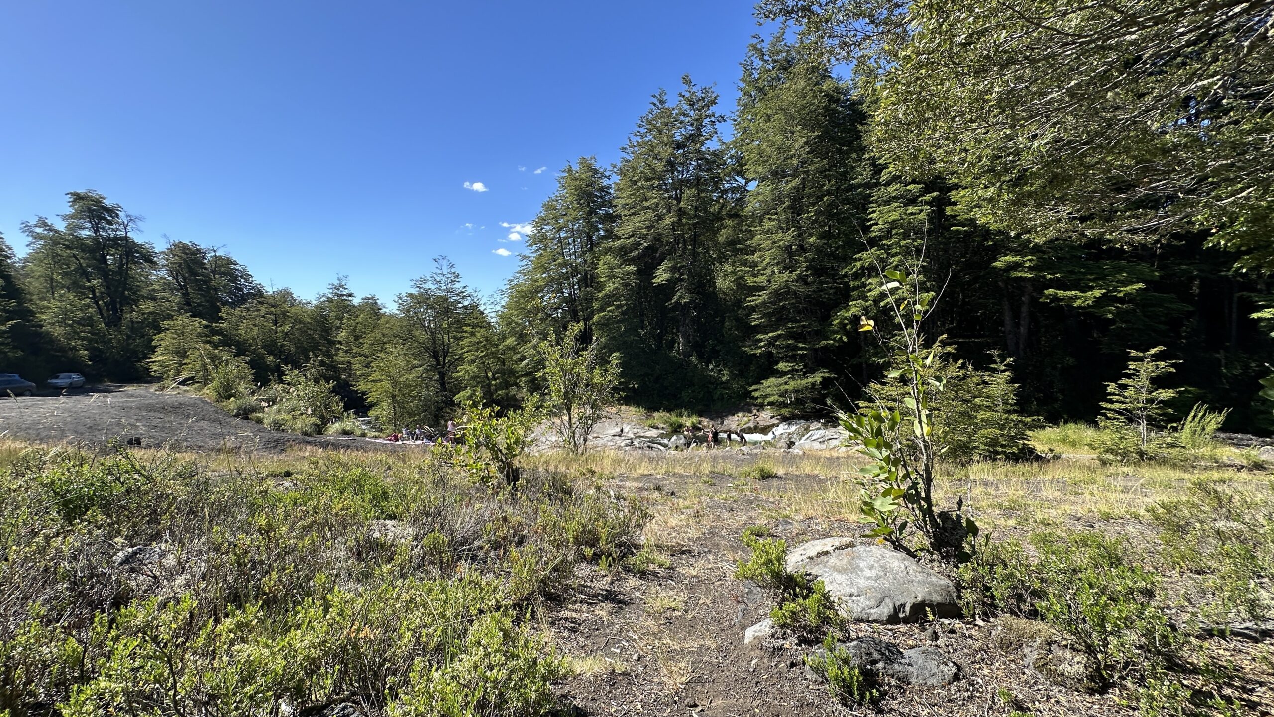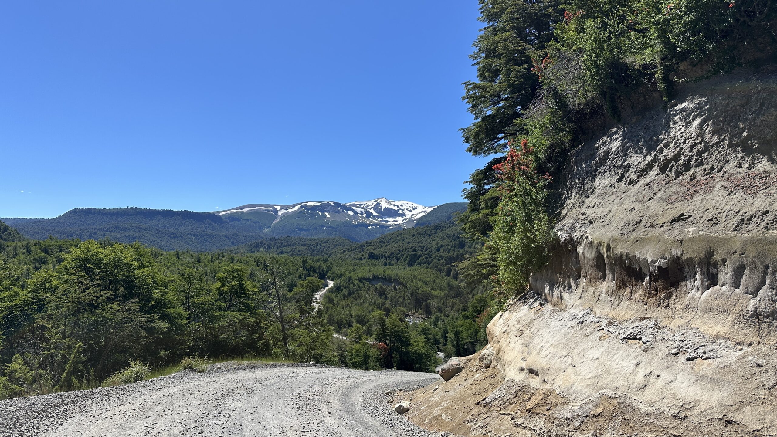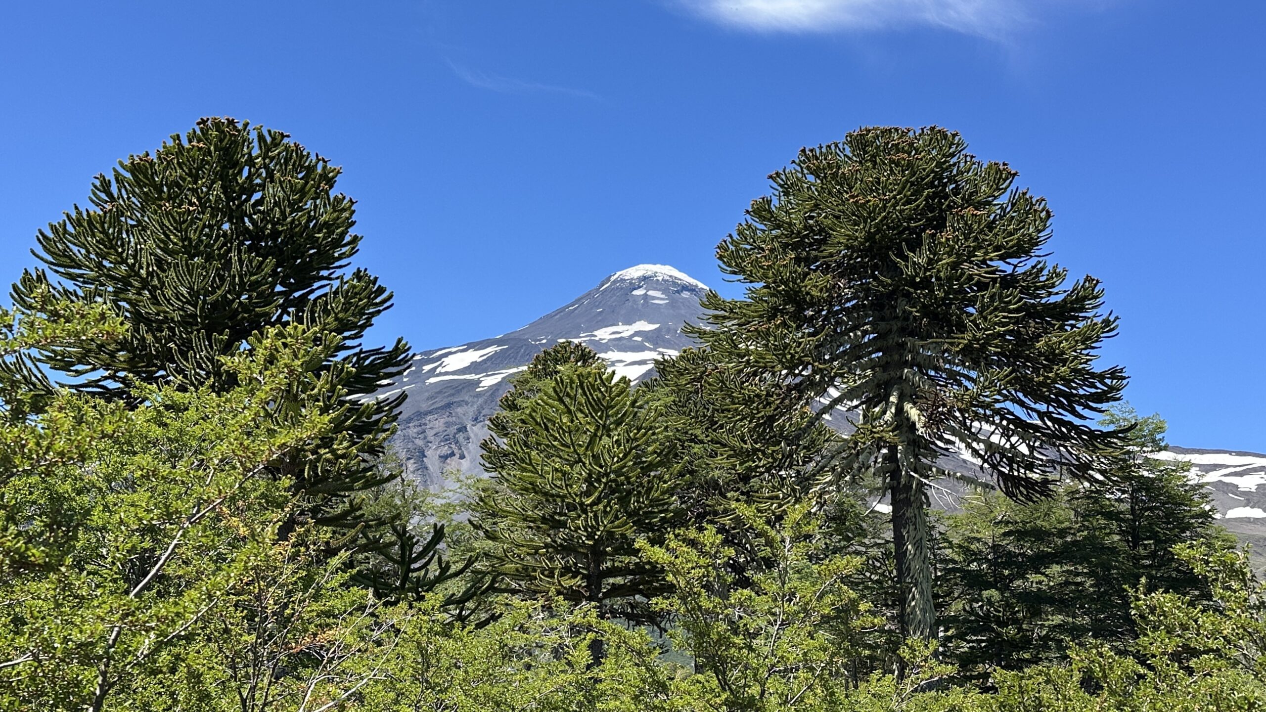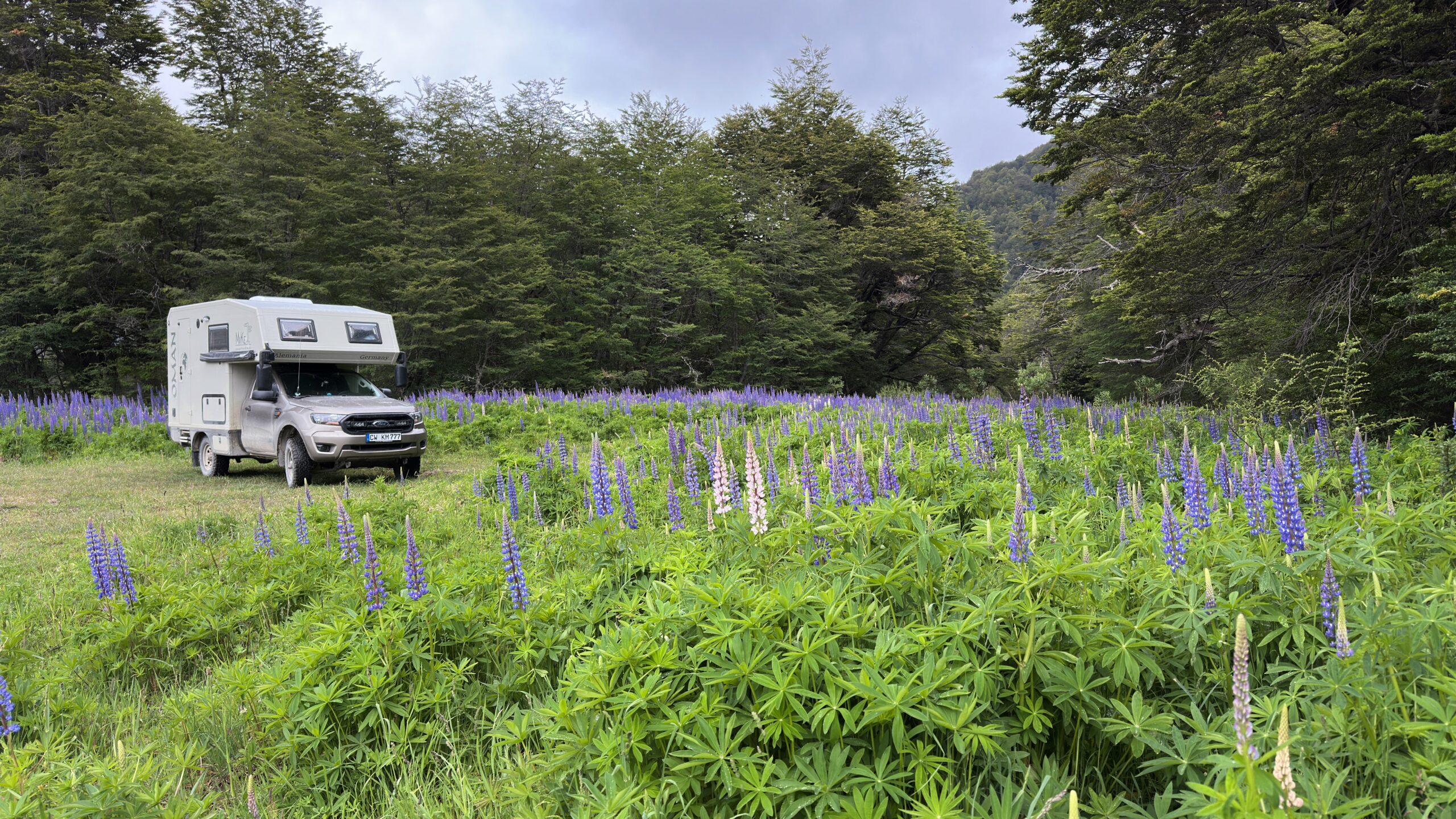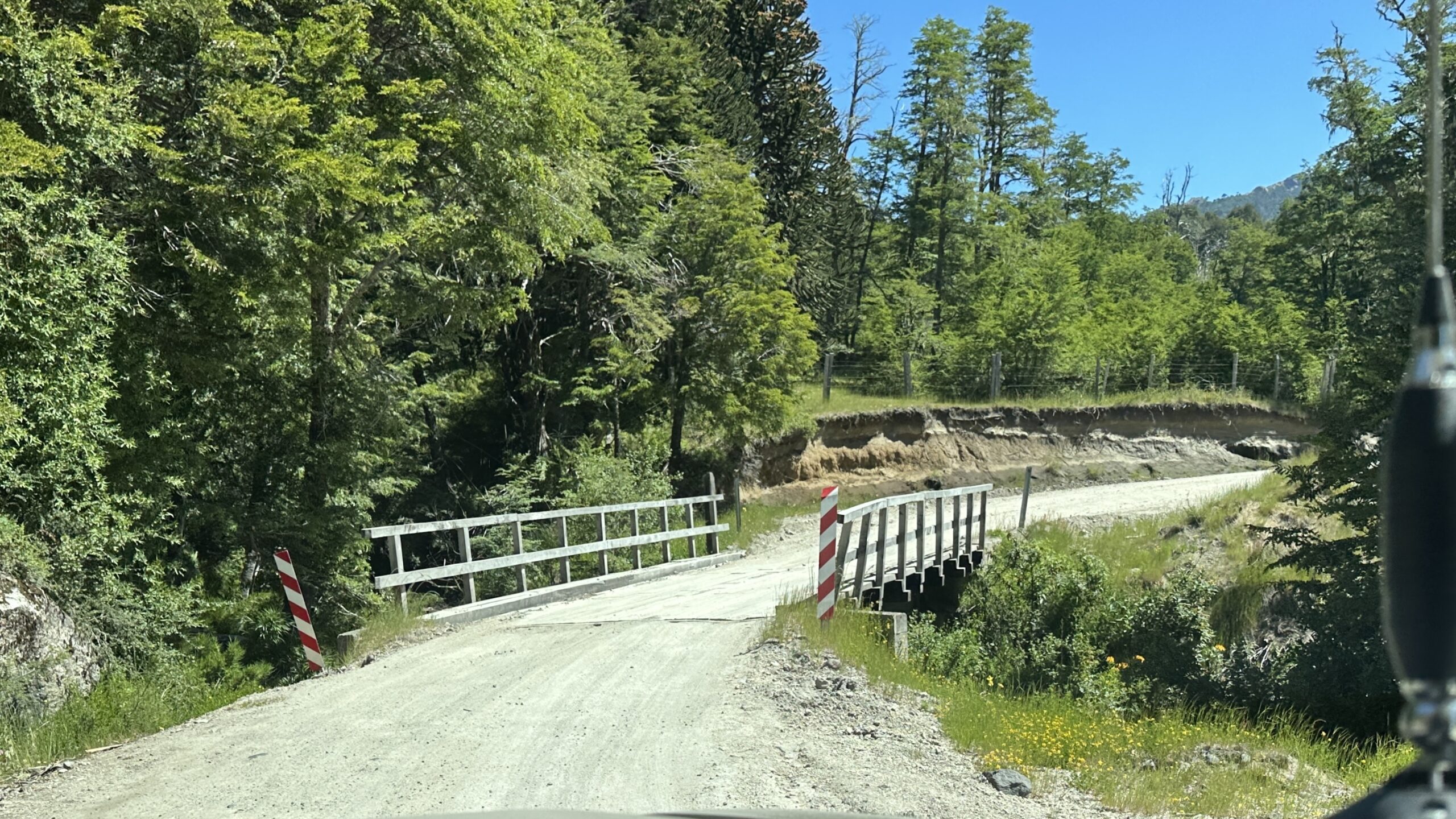 Wir fahren Richtung Norden und wollen über die nächstgelegene Grenze nach Argentinien. Die R-925-S führt durch den Nationalpark mit dem Vulkan Llaima und Sierra Nevada. Am Eingang des Parks sollen wir 30,00 € Eintritt bezahlen. Wir möchten nur durchfahren, das erläutert Micha den Rangern und eine junge Frau kommt zur Hilfe. Sie kann nicht nur Englisch, nein, sie kann sogar Deutsch. Bis 2019 hatte sie Deutsch und jetzt freut sie sich über jede Gelegenheit in Deutsch sprechen zu können. So gelingt die Verständigung noch besser und wir haben ein Zeitfenster von 1 Std. in der wir den Park durchfahren dürfen. Das Zeitfenster einzuhalten wird bei diesen Straßenverhältnissen nicht möglich sein. Wir kennen ja die Pisten mit ordentlich Wellblech, Löchern und Steinen. Jetzt kommt die nächste Challenge: Löcher und Steinbrocken in einem „Tunnel“. Links und Rechts haben wir Erde, Wurzeln, schräg hängende Bäume. Dann hat man auch mal gelegentlich Gegenverkehr. Der Park selber ist landschaftlich wieder eine Wucht. Die Lavafelder, der Lavastrom der durch die Bäume geht. Die Vegetation und dann die Seen, ach ja, und der Vulkan selbst.