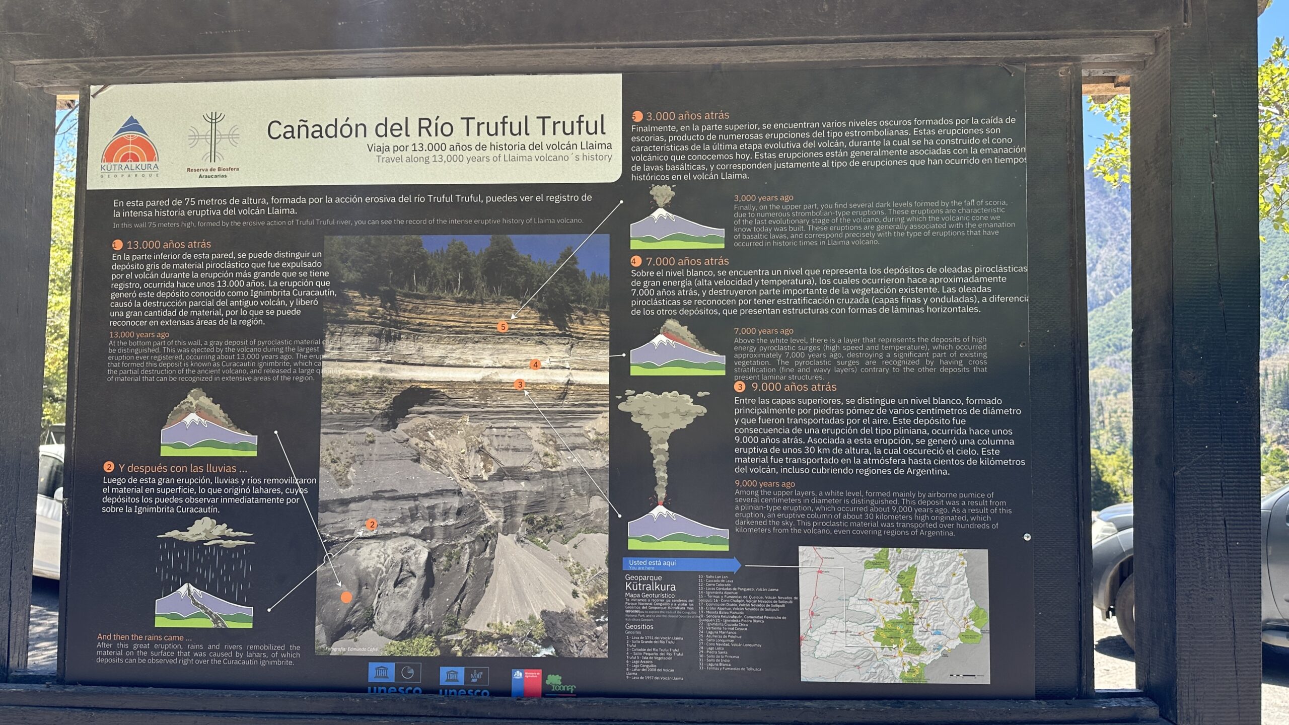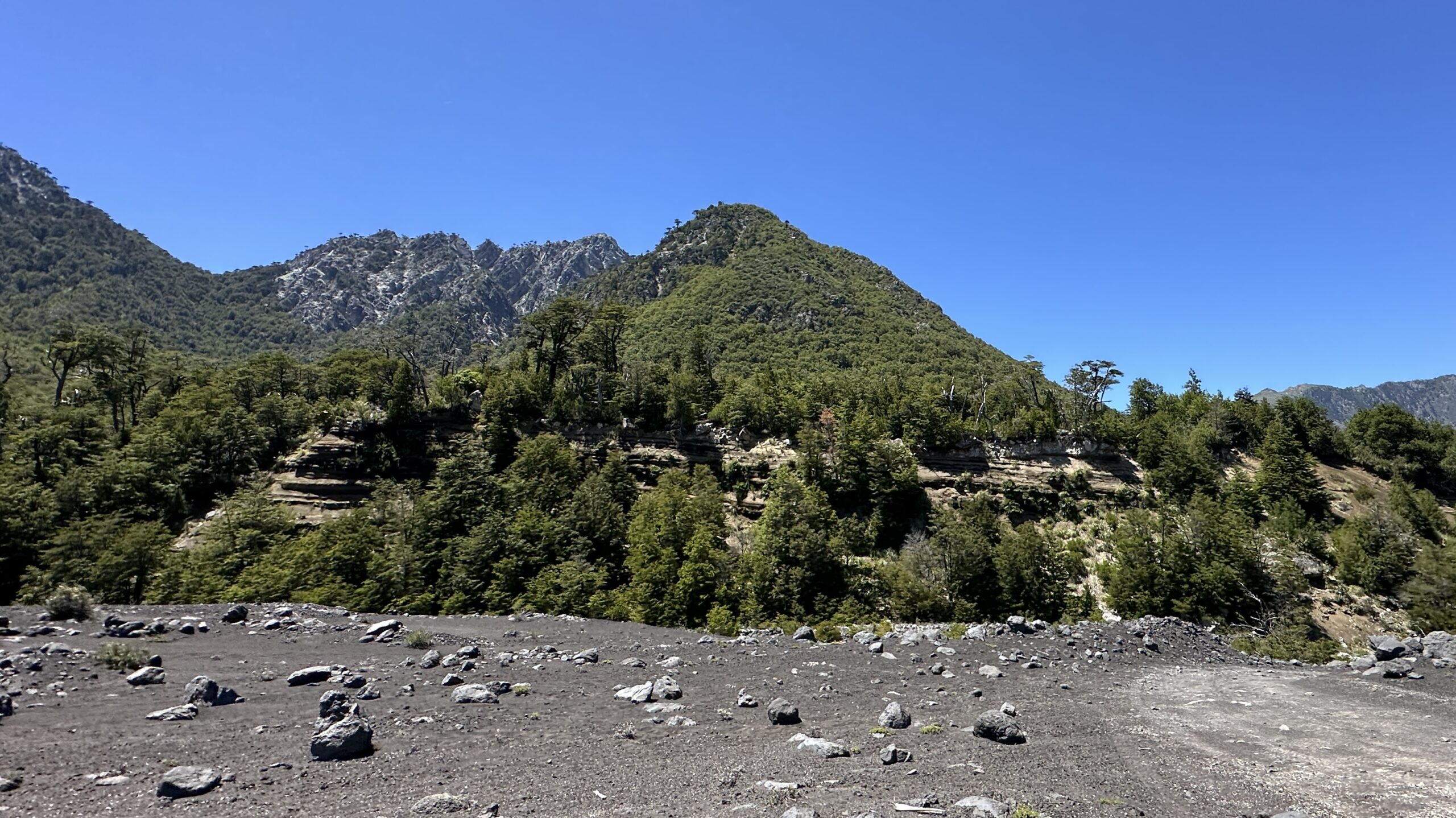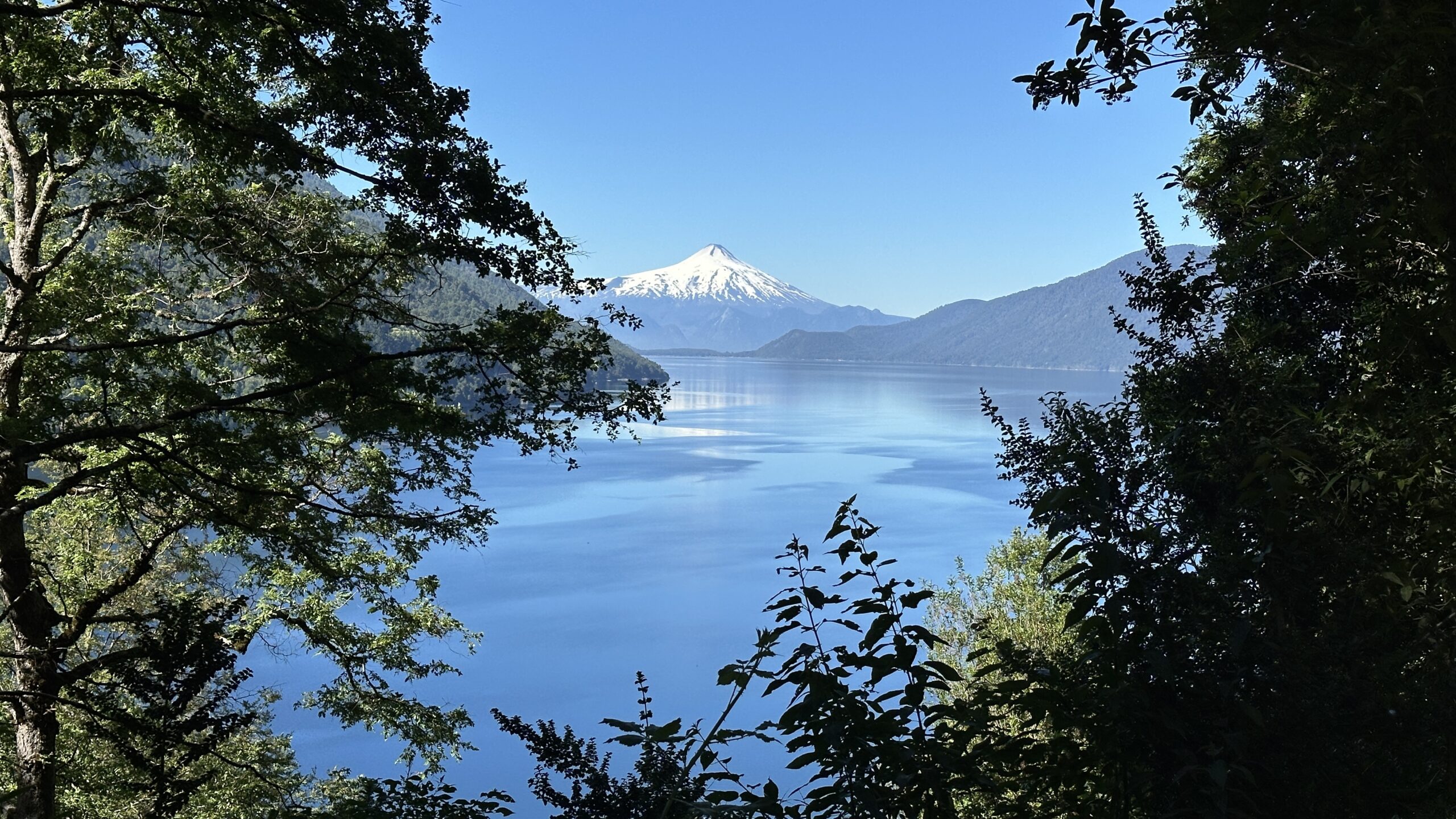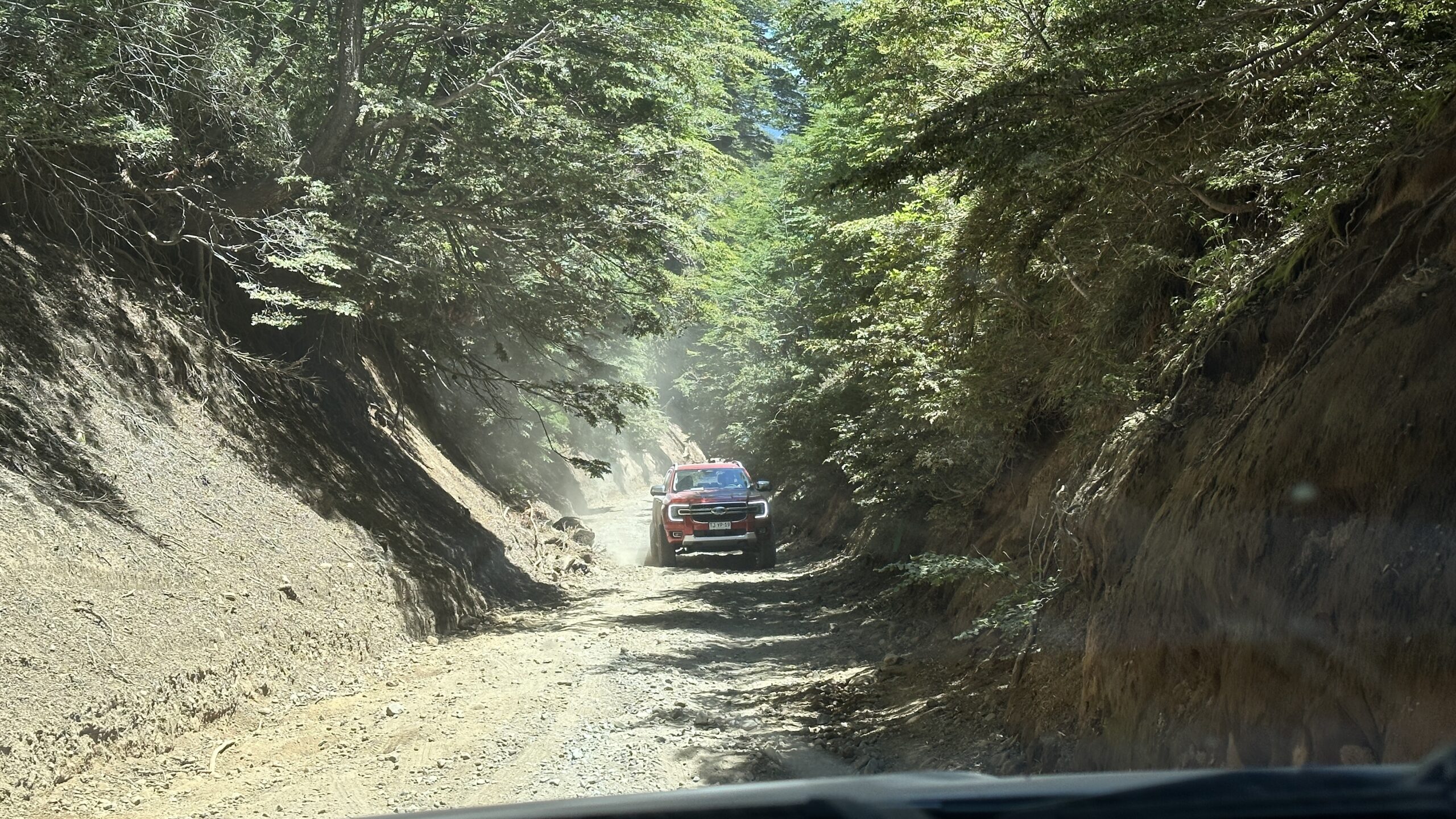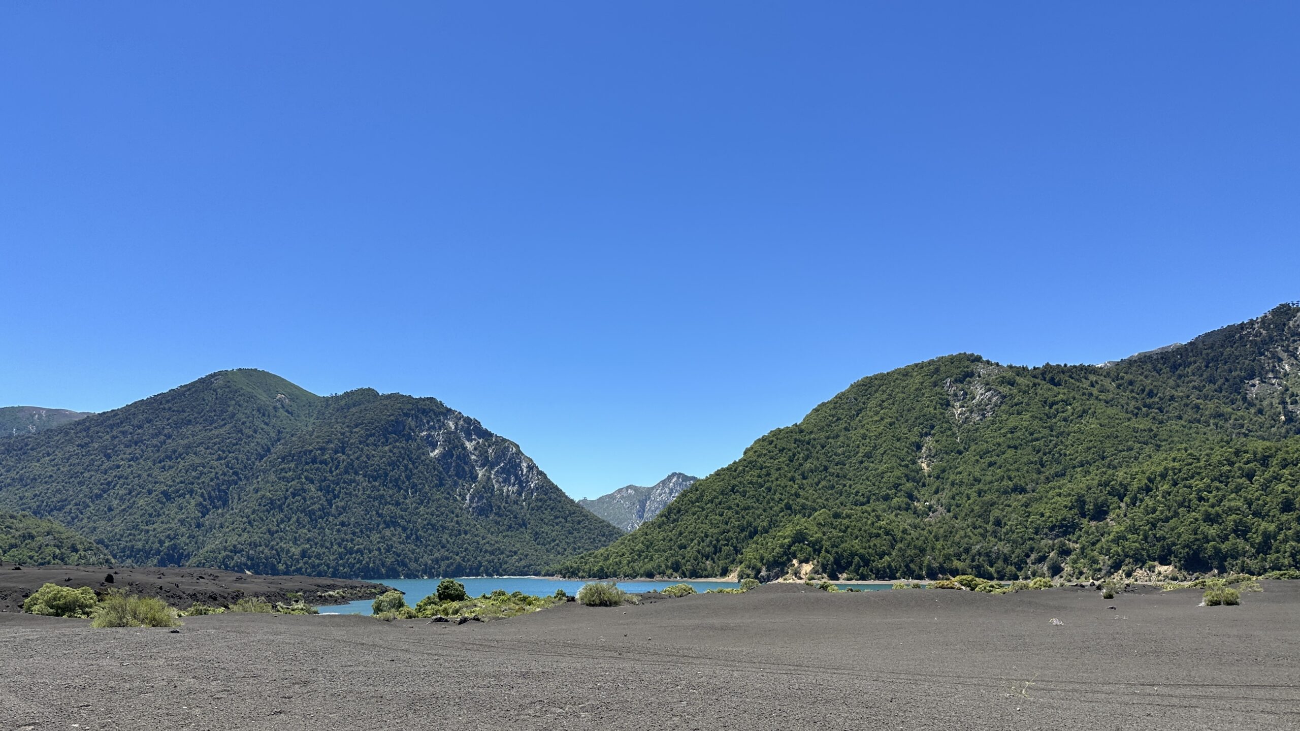 Wir fahren Richtung Norden und wollen über die nächstgelegene Grenze nach Argentinien. Die R-925-S führt durch den Nationalpark mit dem Vulkan Llaima und Sierra Nevada. Am Eingang des Parks sollen wir 30,00 € Eintritt bezahlen. Wir möchten nur durchfahren, das erläutert Micha den Rangern und eine junge Frau kommt zur Hilfe. Sie kann nicht nur Englisch, nein, sie kann sogar Deutsch. Bis 2019 hatte sie Deutsch und jetzt freut sie sich über jede Gelegenheit in Deutsch sprechen zu können. So gelingt die Verständigung noch besser und wir haben ein Zeitfenster von 1 Std. in der wir den Park durchfahren dürfen. Das Zeitfenster einzuhalten wird bei diesen Straßenverhältnissen nicht möglich sein. Wir kennen ja die Pisten mit ordentlich Wellblech, Löchern und Steinen. Jetzt kommt die nächste Challenge: Löcher und Steinbrocken in einem „Tunnel“. Links und Rechts haben wir Erde, Wurzeln, schräg hängende Bäume. Dann hat man auch mal gelegentlich Gegenverkehr. Der Park selber ist landschaftlich wieder eine Wucht. Die Lavafelder, der Lavastrom der durch die Bäume geht. Die Vegetation und dann die Seen, ach ja, und der Vulkan selbst.