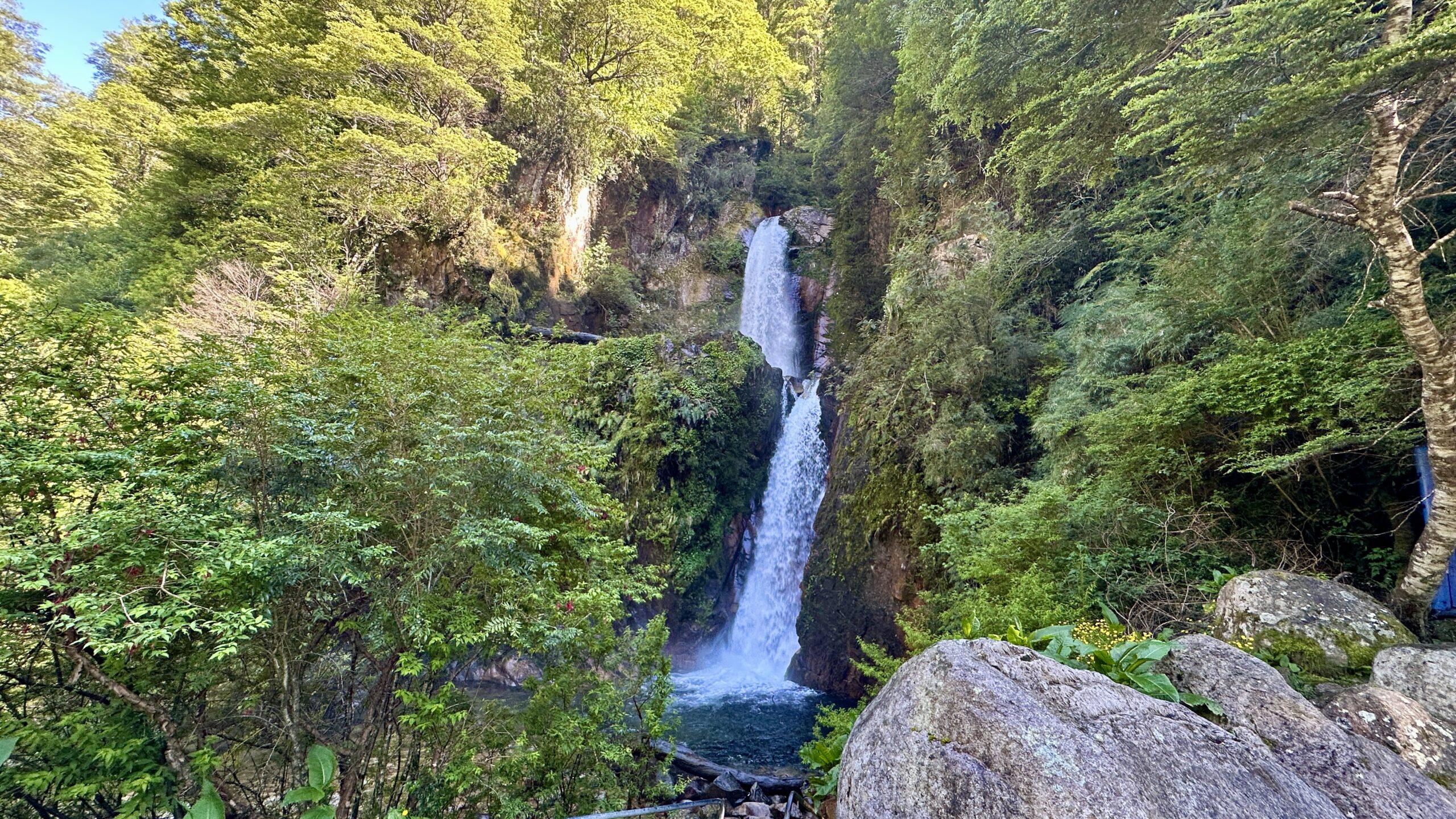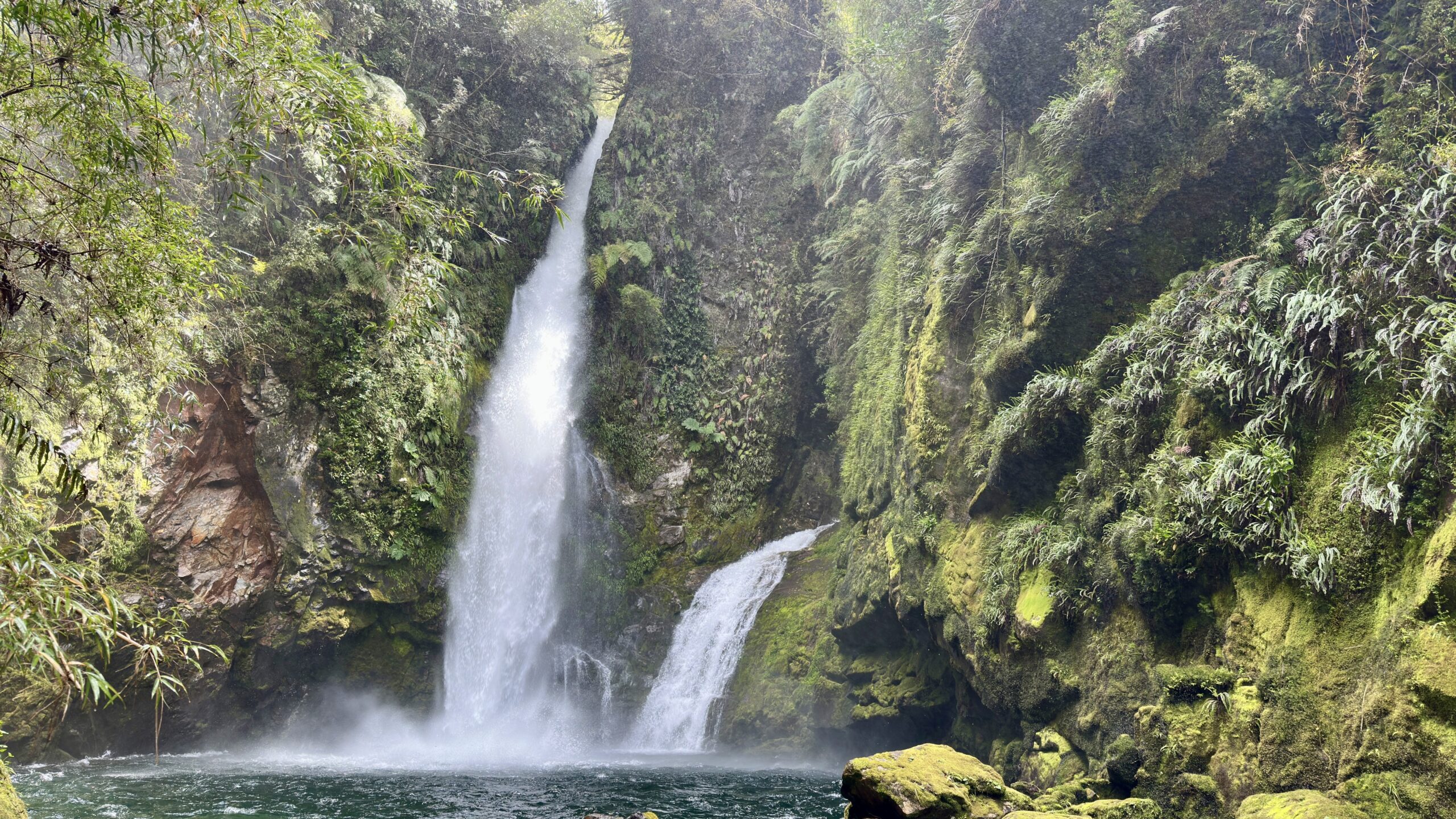 Um 9:00 Uhr brechen wir zu einer kleinen Wanderung auf. Ein Wasserfall und ein Aussichtspunkt auf die beinahe 3.000 m hohen Berge erwarten uns. Auf der Fahrt zu der Wanderung fahren wir wieder an dem türkisen See entlang, ein starker Kontrast zu dem grün der Berge. Dann sind da noch die blühenden Blumen & Sträucher am Wegesrand. Grandios.