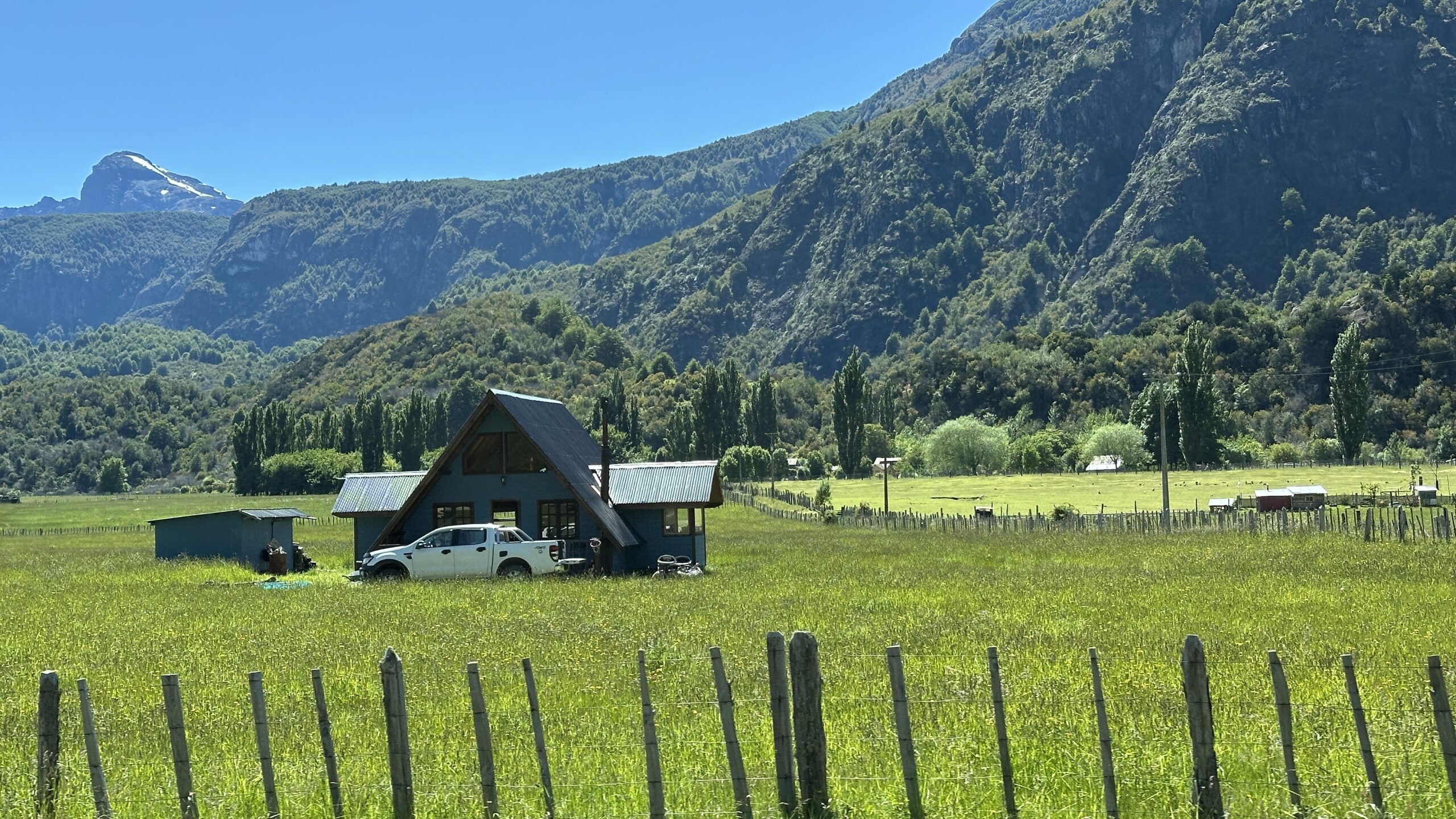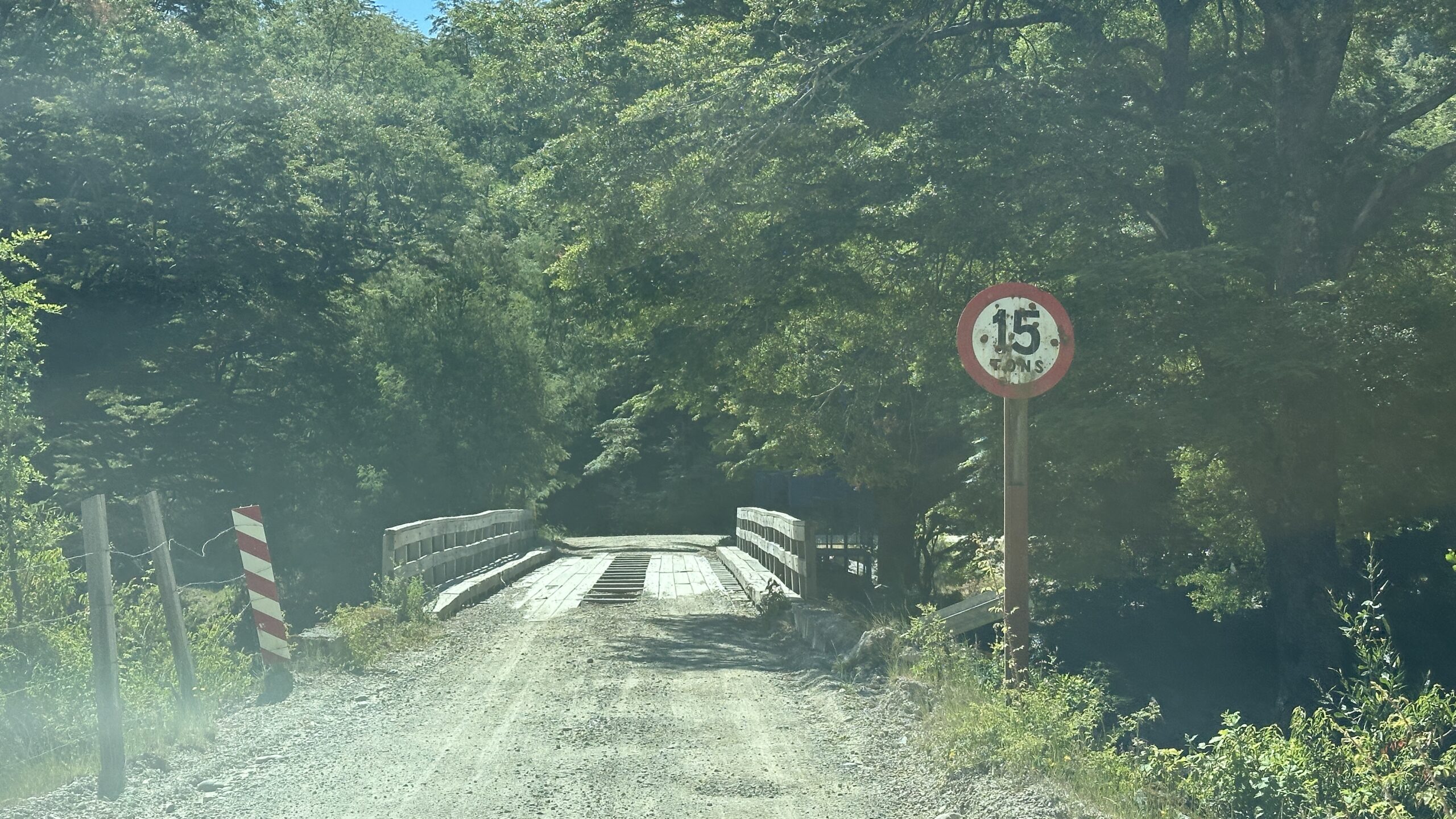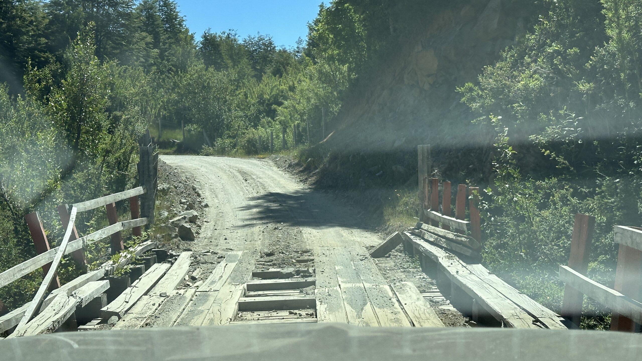 Wir fahren die Rutas – 965. Micha hatte diese Straße gewählt, da es zu unserem erwählten Stellplatz der kürzere Weg ist. Das Navi will einen ziemlichen Bogen fahren. Luftdruck runter und los geht es. Die Piste ist schlecht, die Aussicht grandios. Neben der Straße fließt ein Bergfluss, Felder und Wiesen grenzen an ihn. Verteilt stehen Häuser in dem Tal. Wunderbar. Wir sehen auch den Nevados de Sollipulli. Ein großer grauer Berg mit Schneefeldern. Die Fahrt geht über Brücken unterschiedlichster Beschaffenheit und die Piste gibt alles. Die kleinen Durchfahrten im Dorf verschaffen eine kurze Pause. Diese sind asphaltiert.
